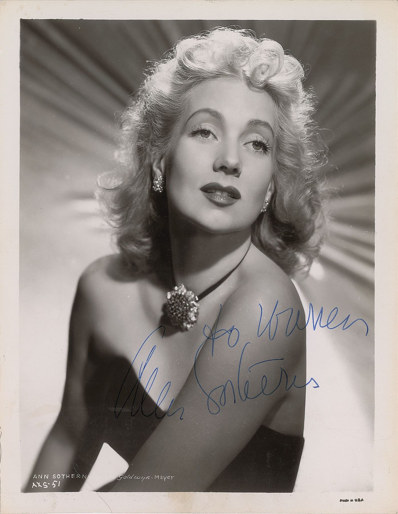American actress (1909–2001) who worked on stage, radio, film, and television, in a career that spanned nearly six decades. Vintage glossy 8 x 10.25 MGM studio portrait of Sothern wearing a strapless gown, signed and inscribed in fountain pen, "To Warren, Ann Sothern.” In fine condition, with a couple areas of irregularity to the emulsion.