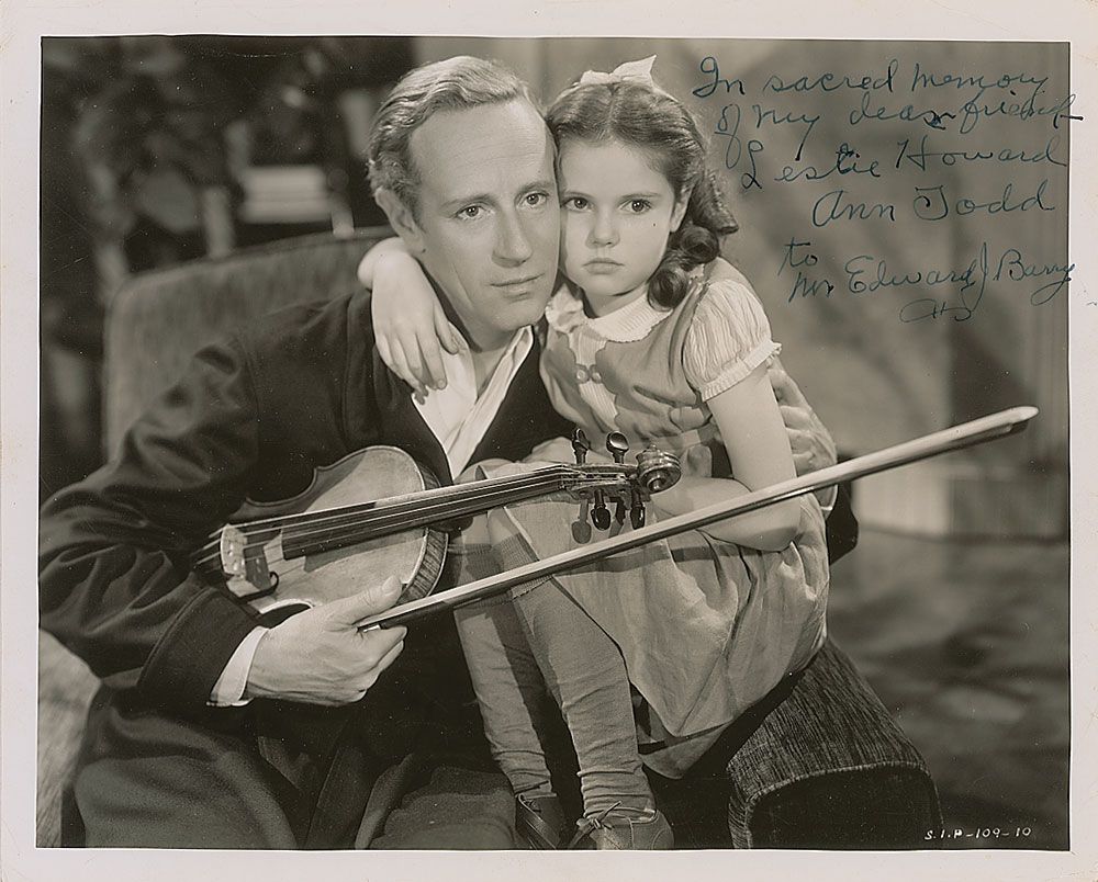 Vintage glossy 10 x 8 photo of Todd in the arms of Leslie Howard in the 1939 film Intermezzo, signed and inscribed in fountain pen, “In sacred memory of my dear friend Leslie Howard, Ann Todd, to Mr. Edward Berry.” Original press caption remains affixed to reverse. Scattered creases, otherwise fine condition.