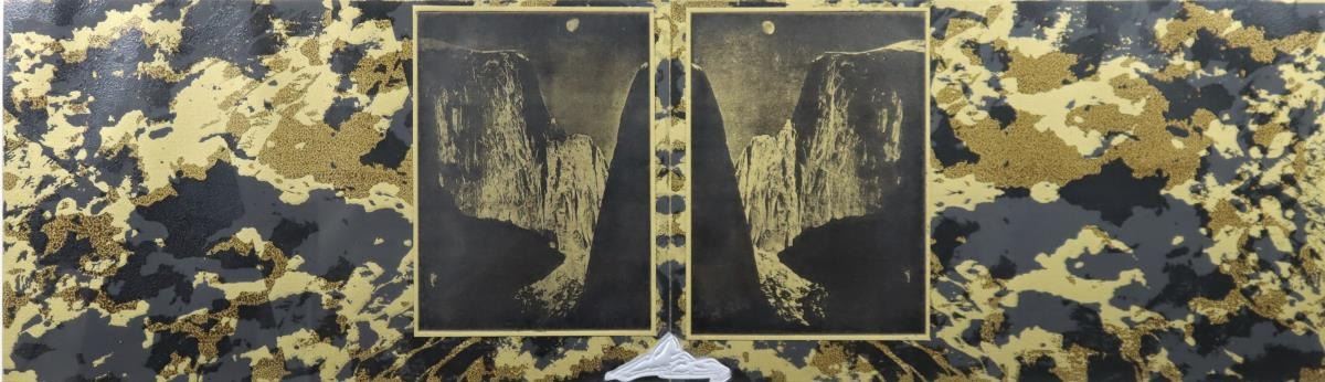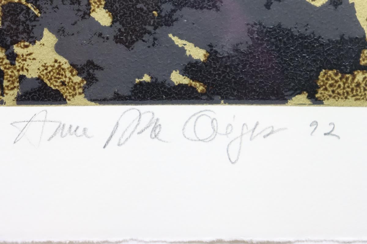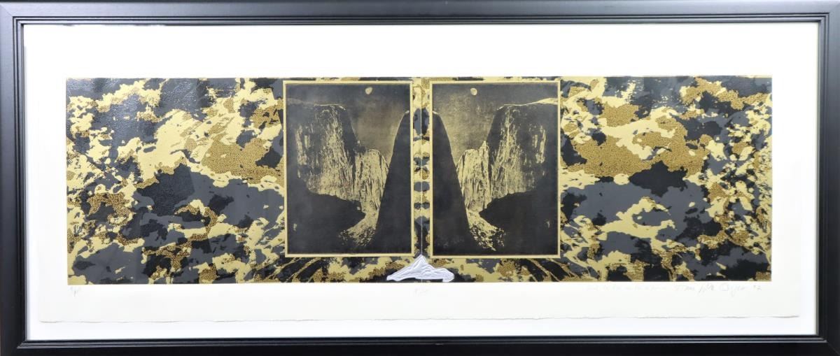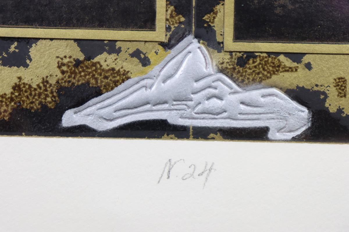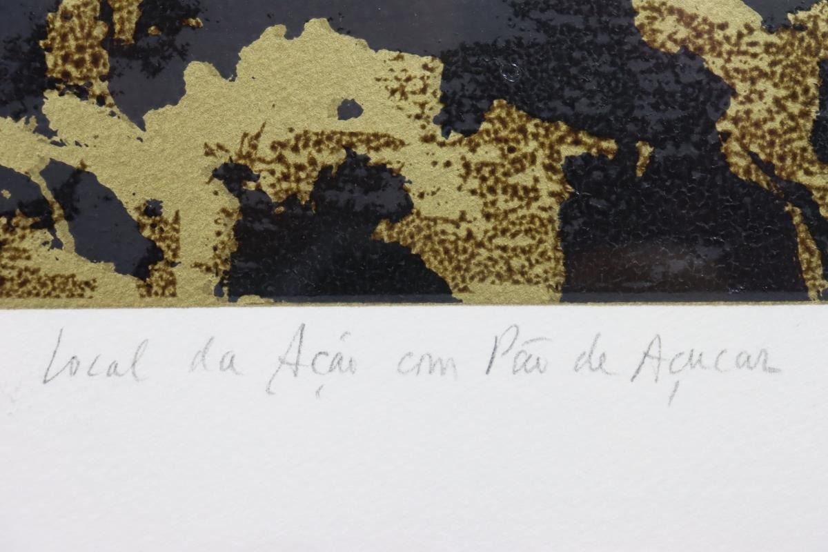 Mixed Media black and gold print numbered 9/100, titled in Portuguese, signed in pencil, framed under glass.