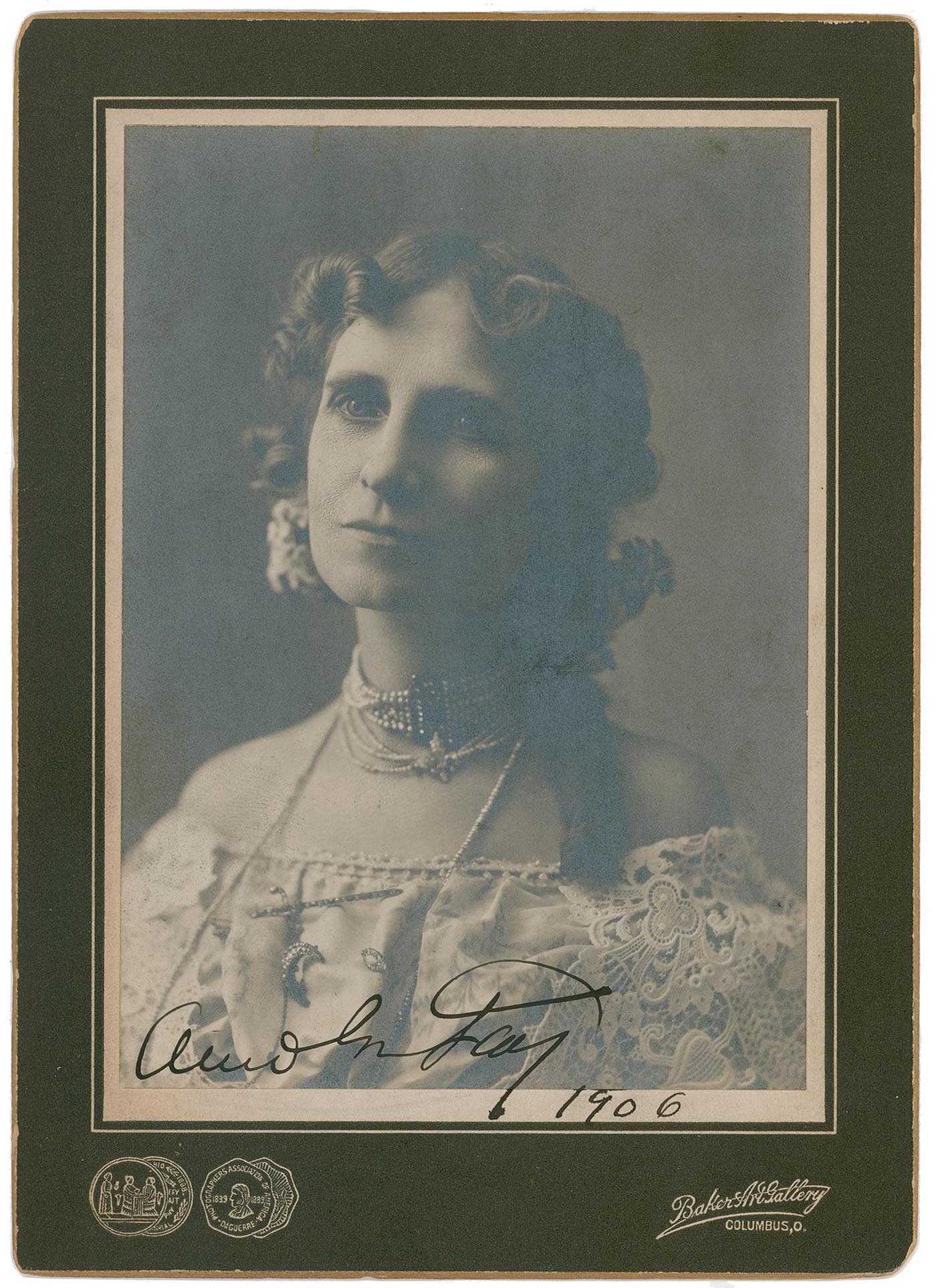 One of the most renowned mediums and stage mentalists of the twentieth century (1851–1927) and a close friend of Harry Houdini. Scarce vintage matte-finish 4 x 5.5 photo by Baker Art Gallery of Columbus, Ohio, and affixed to its original 5 x 7 mount, signed in fountain pen, “Anna Eva Fay 1906.” In fine condition, with silvering to darker areas of image and background, some light spotting, and a few edge dings to mount.
