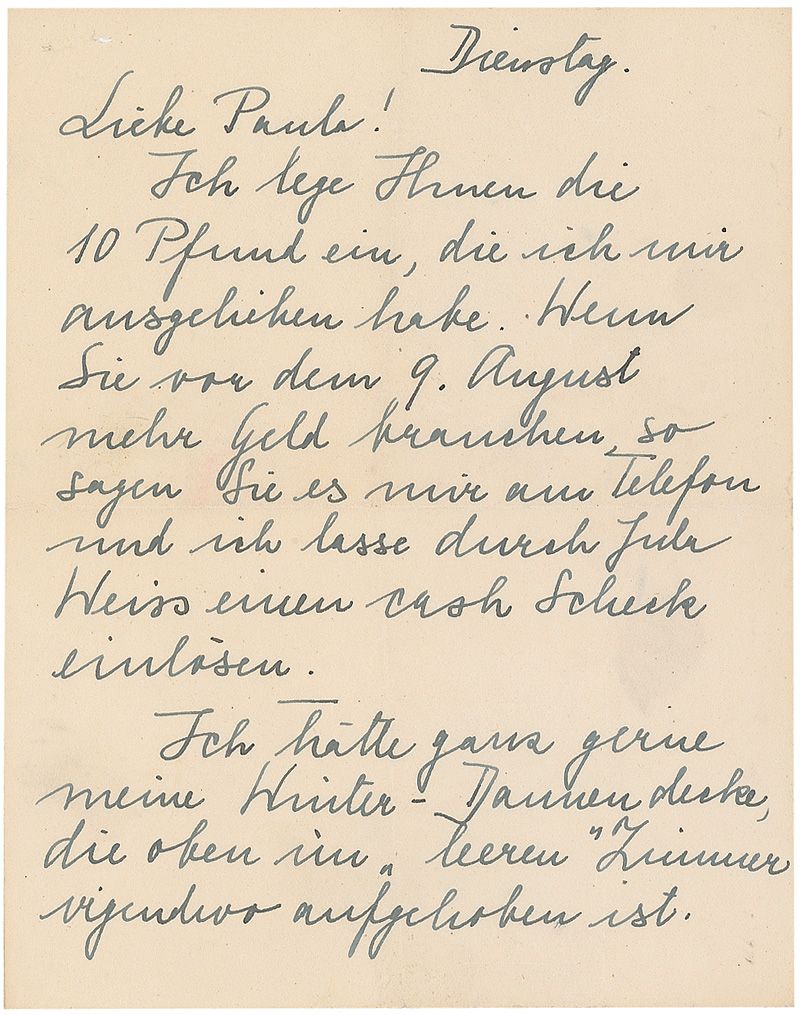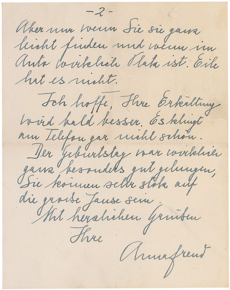 Daughter of Sigmund Freud (1895–1982) and pioneer in the psychoanalysis of children. ALS in German, two pages, 5.5 x 7, no date. Letter to a friend. In part (translated): “I include the 10 pounds that I borrowed from you. If you need more money before August 9th tell me on the phone, and I shall have Julia Weiss cash a check. I should like to have my winter down blanket, which is kept upstairs in the ‘empty’ room. But only if you can find it easily, and if there is enough space in the car. It’s no rush. I hope your cold has gotten better. On the phone it didn’t sound too good. The birthday was a great success, you can be proud of the great bash.” In very good condition, with intersecting folds, scattered wrinkling, staple holes to the upper left corner, and two small repaired tears to the reverse of the second page.