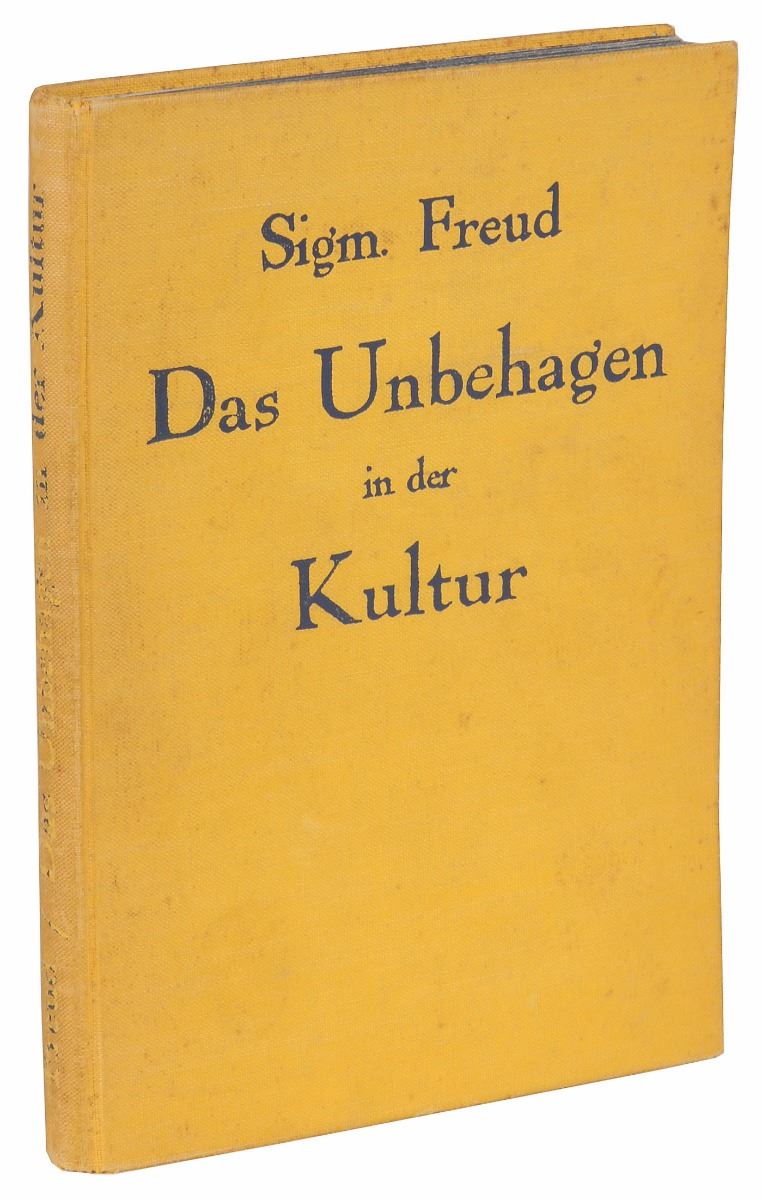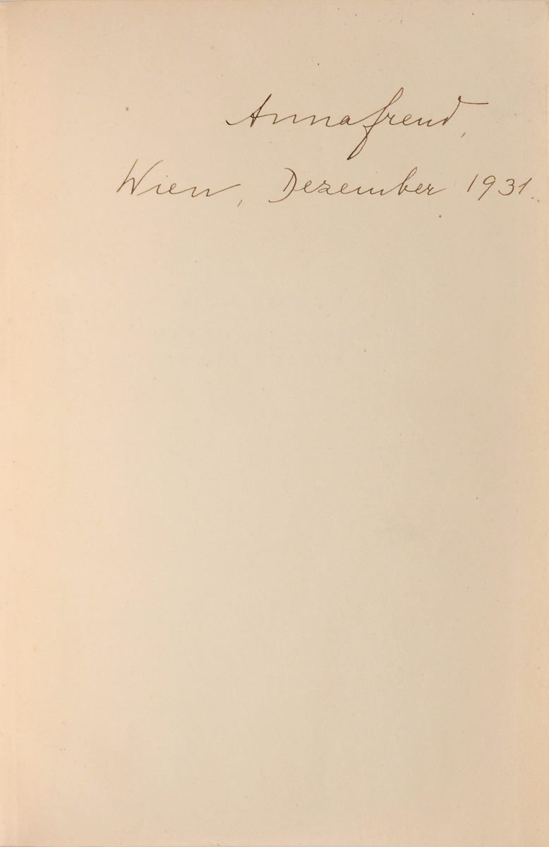 Pioneer of psychoanalytic child psychology (1895–1982) who was the daughter of Sigmund Freud. Signed book in German: Das Unbehagen in der Kultur [Civilization and Its Discontents] by Sigmund Freud. Vienna, Austria: International Psychoanalytic Publishing Company, 1931. Hardcover, 5.25 x 7.5, 136 pages. Signed on the first free end page in black ink in the year of publication, "Anna Freud, Wien, December 1931." In fine condition, with light wear to spine. At the time she signed this book, Anna Freud was serving as secretary of the International Psychoanalytical Association. Pre-certified PSA/DNA.