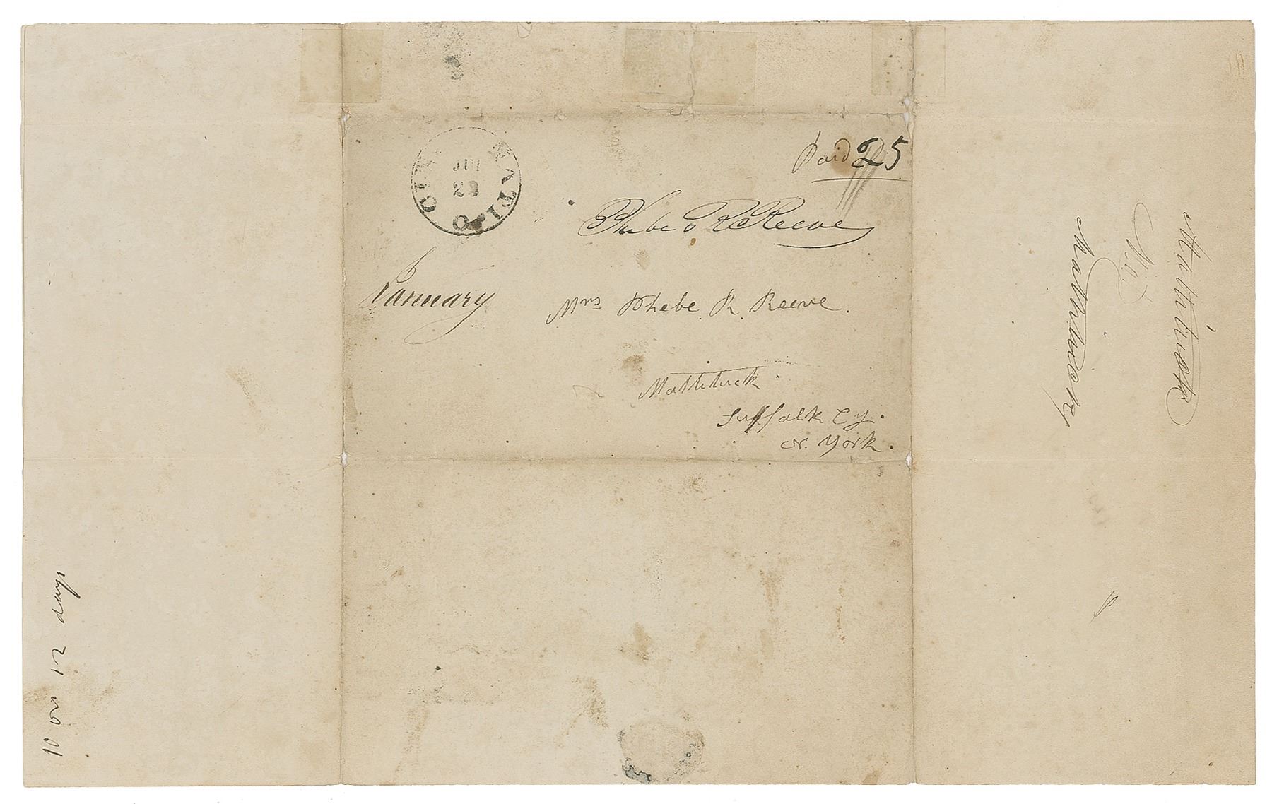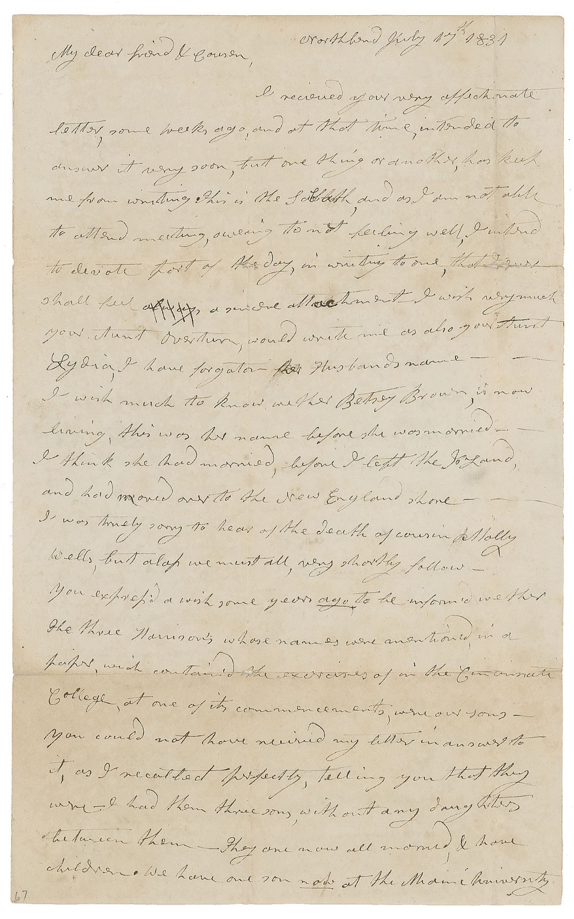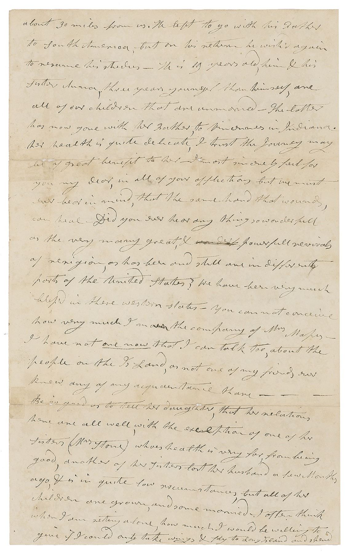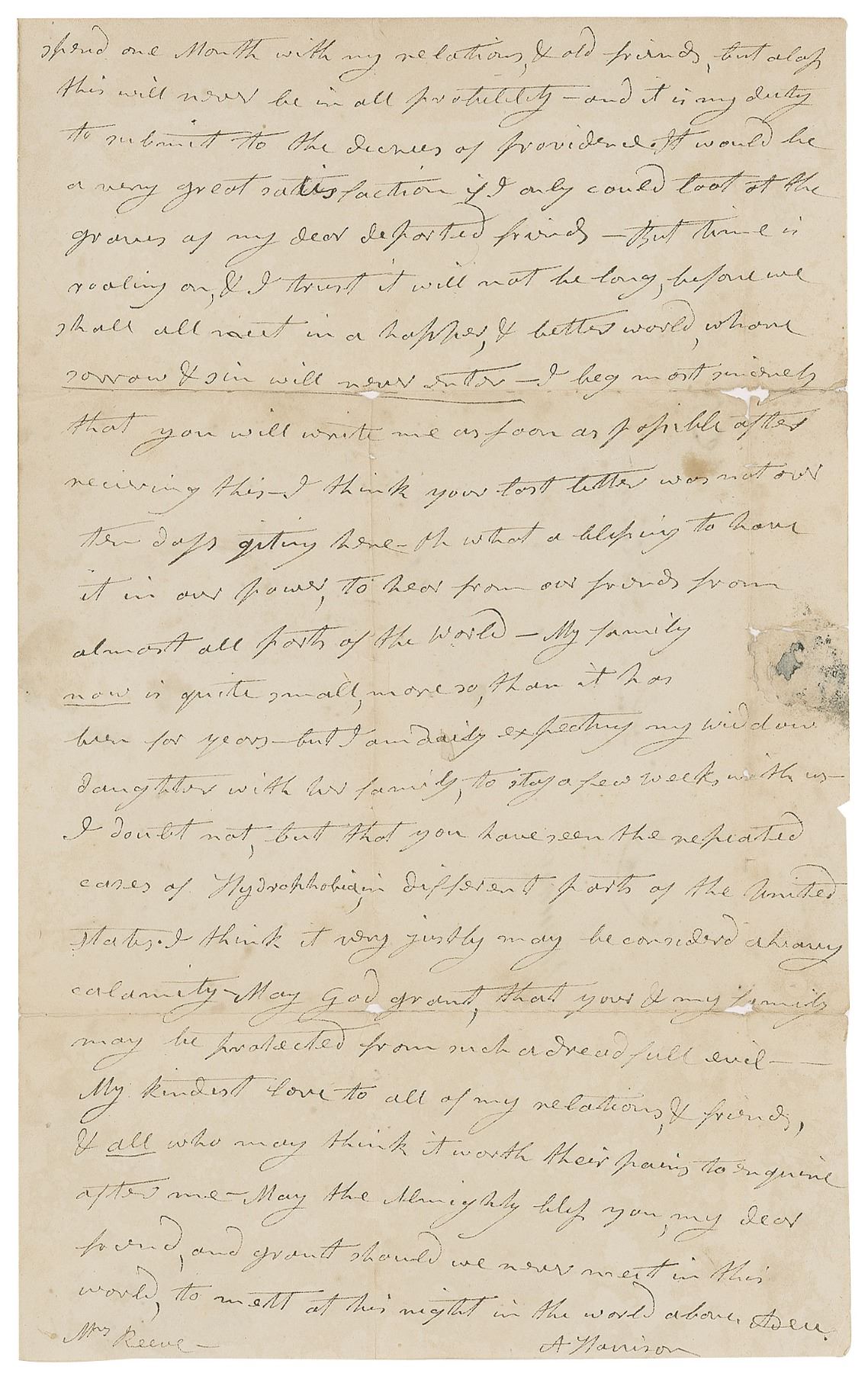 ALS signed “A. Harrison,” three pages on two adjoining sheets, 7.75 x 12.5, July 17, 1831. Letter to Mrs. Phebe R. Reeve in Mattituck, New York, relaying family gossip and news. In part: "This is the Sabbath, and as I am not able to attend meeting, owing to not feeling well, I intend to elevate part of the day in writing to one…[I] was truly sorry to hear of the death of cousin Molly Wells, but alas we must all, very shortly follow. You expressed a wish some years ago to be inform'd wether the three Harrison's whose names were mentioned, in a paper, which contain'd the exercises of in the Cincinnati College, at one of its commencements, were our sons—you could not have received my letter in answer to it, as I recalled perfectly, telling you that they were—I had then three sons, without any daughters between them—They are now all married, & have children. We have one son now at the Miami University…He is 19 years old, him & his sister Anna, three years younger than himself, are all of our children that are unmarried. The latter has now gone with her Father, to Vincennes in Indiana. Her health is quite delicate…Did you ever hear anything so wonderful as the very many great & powerfull revivals of religion, as has been and still are in different parts of the United States? We have been very much blessed in these western states." Addressed on the integral leaf in Harrison's hand. In very good condition, with scattered light staining, and splitting along intersecting folds.