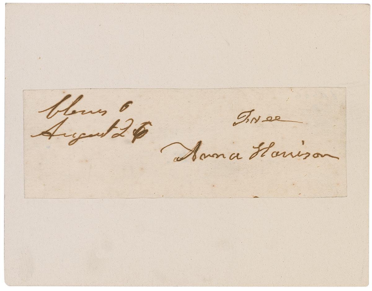Wife (1775–1864) of President William Henry Harrison and grandmother of President Benjamin Harrison, who served nominally as First Lady of the United States during her husband's one-month term in 1841, but she never entered the White House. Rare ink franking signature, “Free Anna Harrison,” on an off-white 4.25 x 1.75 off-white clipped slip, dated in another hand, “August 26,” and affixed to a slightly larger off-white card. In fine condition, with some scattered light foxing.