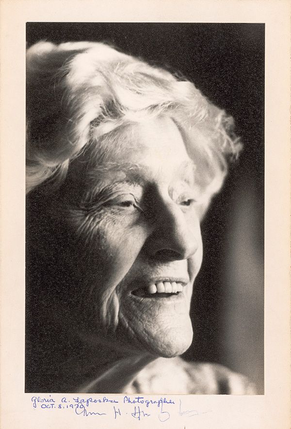 American sculptor (1876–1973) best known for her sculptures of animals. Satin-finish 4.5 x 7 photo of Huntington mounted to a 5.5 x 8 board, signed on the board in old age in blue ballpoint. In fine condition, with light pressure toward the end of the signature and an ink notation about the photographer.