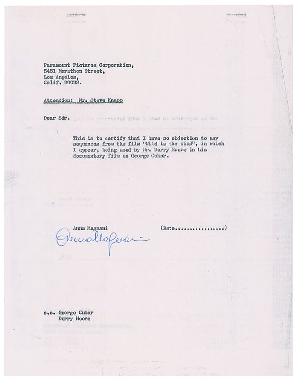 Italian actress (1908–1973) who won an Academy Award for her role in the 1955 film The Rose Tattoo. DS, one page, 8.5 x 11, no date. Agreement between Magnani and Paramount Pictures. In full: “This is to certify that I have no objection to any sequences from the film ‘Wild Is the Wind,’ in which I appear, being used by Dr. Derry Moore in his documentary film on George Cukor.” In fine condition, with a few scattered creases and a paperclip impression and soiling to top edge.
