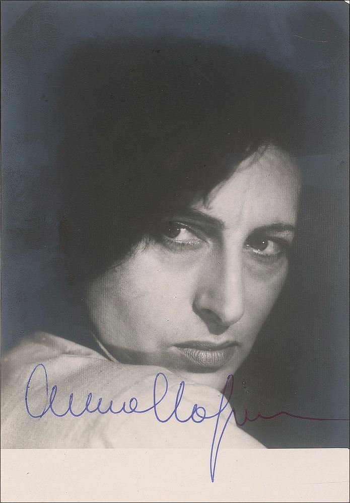 Italian stage and film actress (1908–1973) who won the Academy Award for Best Actress for her portrayal of a Sicilian widow in The Rose Tattoo. Vintage 4 x 5.75 postcard photo of Magnani looking over her shoulder, signed in blue ballpoint. In fine condition, with light silvering to dark areas of the image.