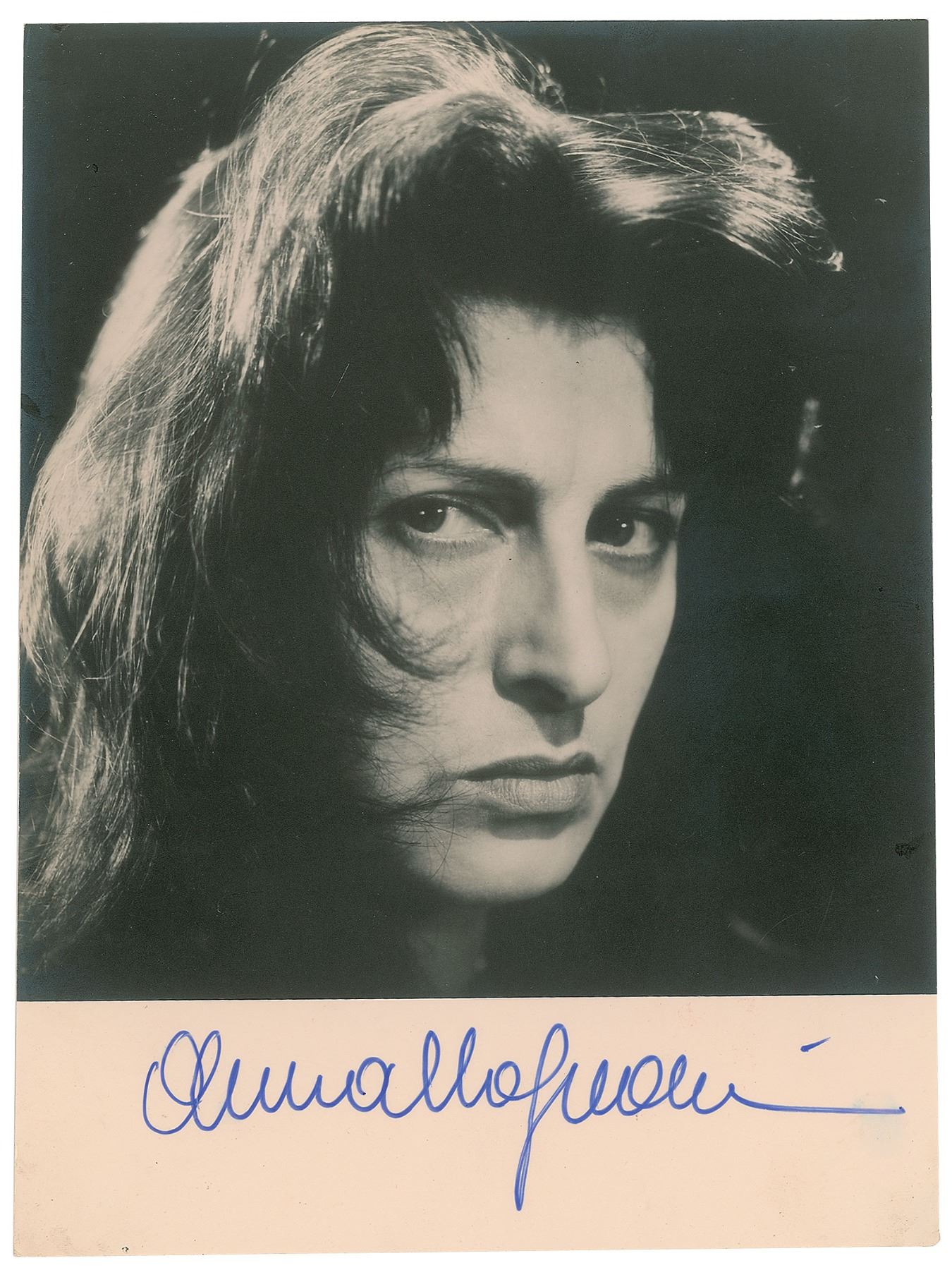 Matte-finish 6.5 x 8.75 close-up photo of the Oscar-winning actress with an intense expression, signed in the lower border in blue felt tip by Anna Magnani. Reverse bears a De Pretore & Figli stamp. In fine condition, with light silvering to the darker areas of the image.