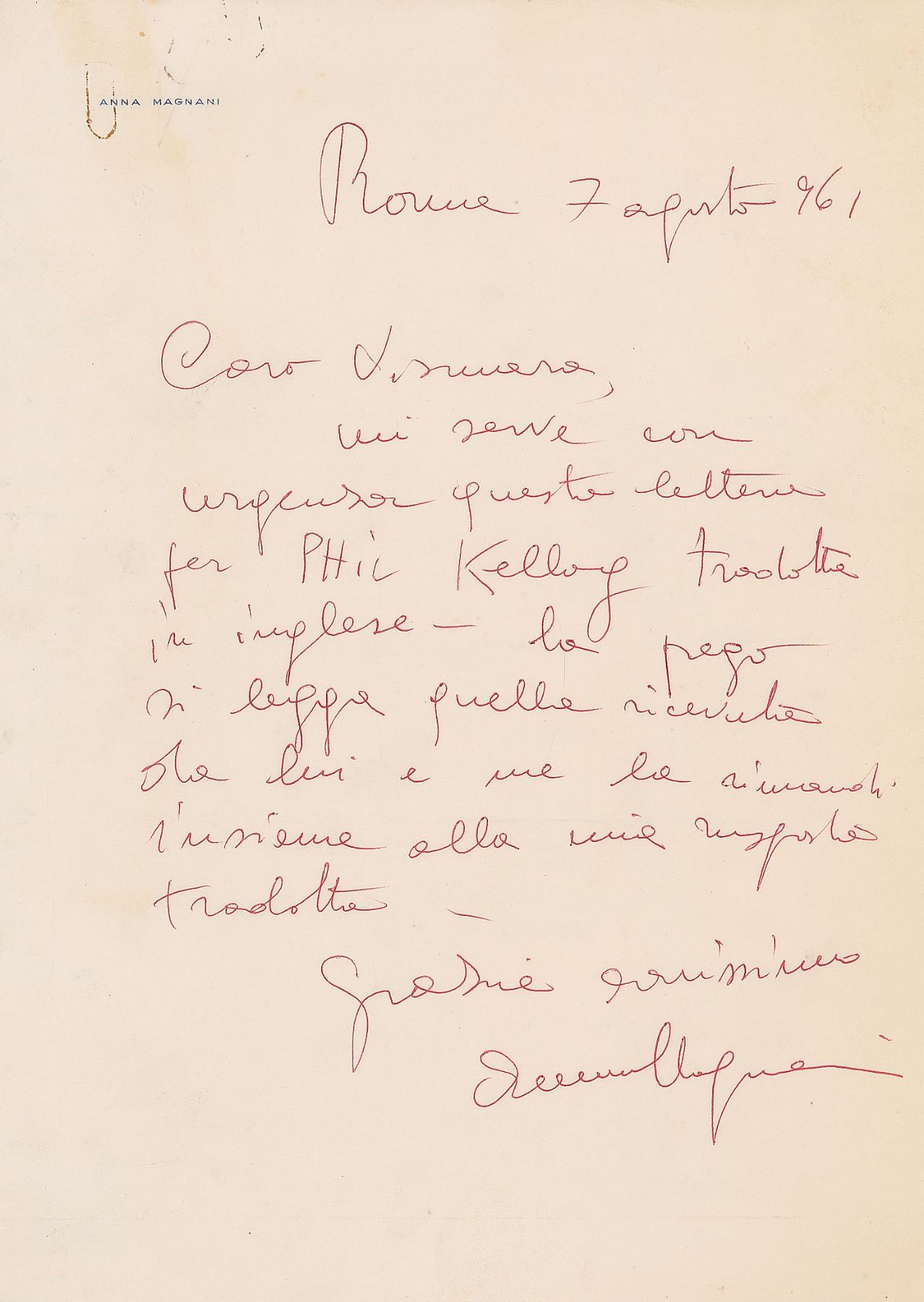 Italian stage and film actress (1908–1973) who won the Academy Award for Best Actress for her portrayal of a Sicilian widow in The Rose Tattoo. ALS in Italian, one page, 8.25 x 11.5, personal letterhead, August 7, 1961. Letter requesting the translation of a letter for Phil Kellog. In fine condition, with light rusty paperclip impressions to the upper left corner.