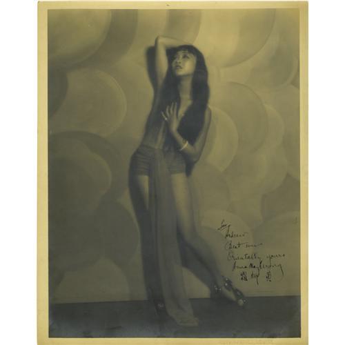 <B>Anna May Wong Signed Photo.</B></I> A gorgeous b&w 11" x 14" photo of the pioneering Chinese-American actress by early Hollywood glamour photographer Ruth Harriet Louise, inscribed and signed by Wong in black ink. The photo features Louise's studio stamp on the back, and her name is embossed on the lower right corner. In Very Fine to Excellent condition with light edge wear and moderate overall tanning. <I>Accompanied by LOA from PSA/DNA.</B></I> <BR><BR><B>Important notic