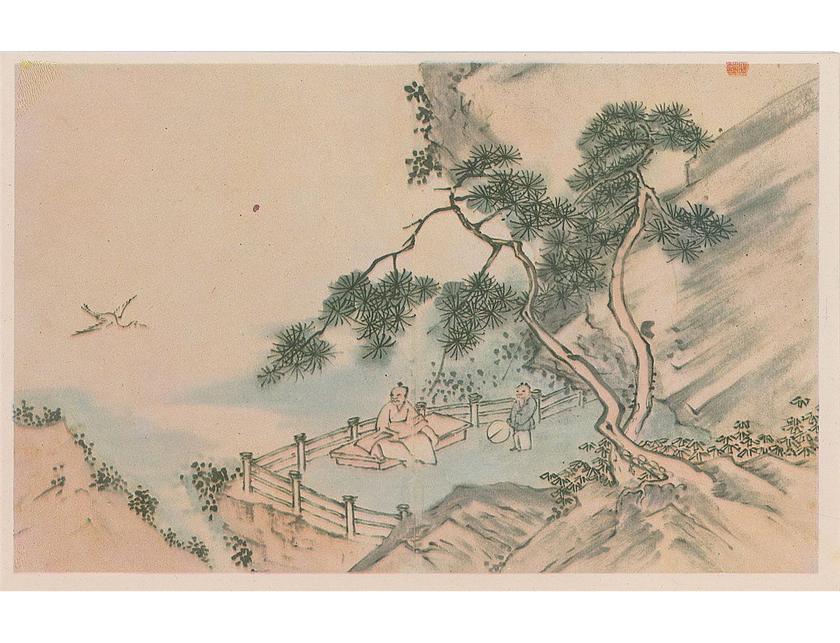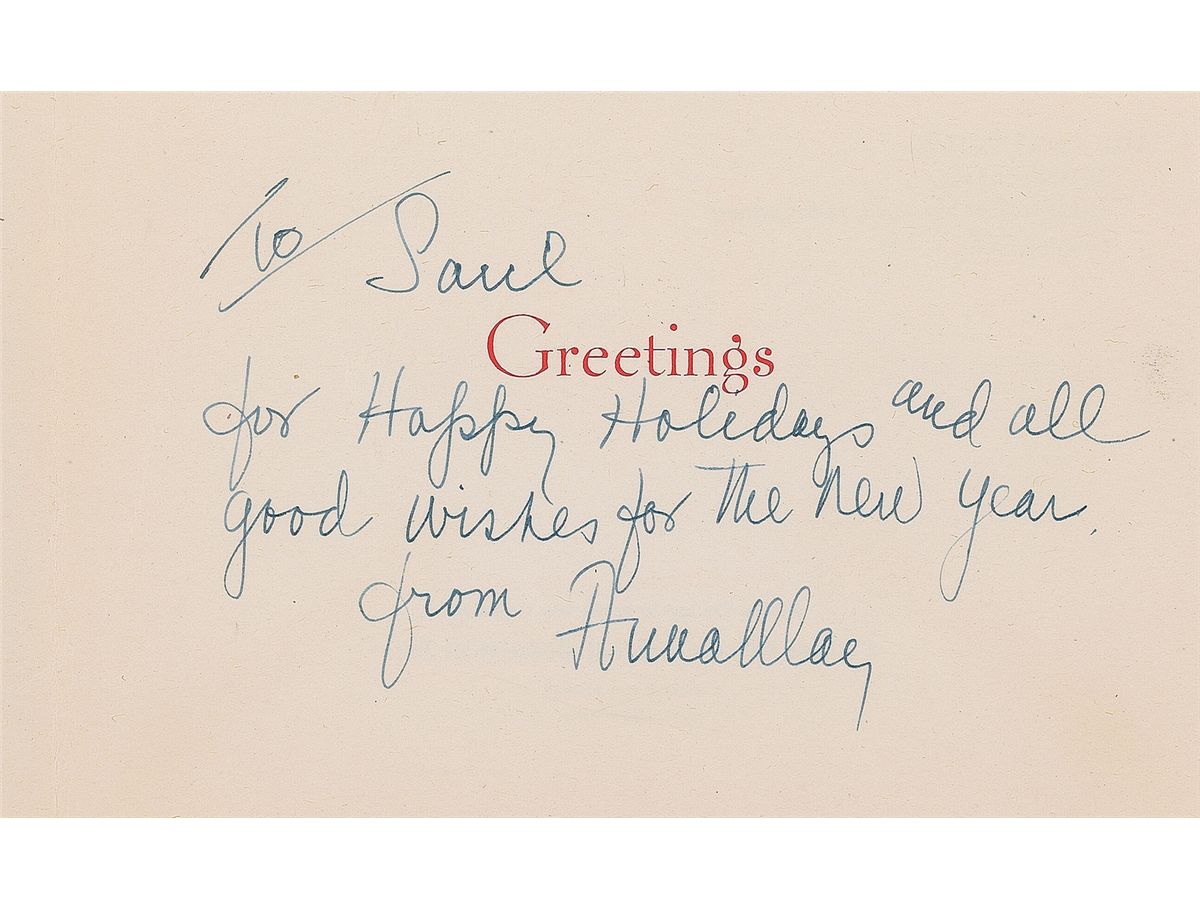 Holiday greeting card featuring a traditional Chinese scene, 6 x 3.75, signed and inscribed inside in fountain pen, “To Saul, for Happy Holidays and all good wishes for the New Year. From, Anna May.” Reverse indicates that the card was produced by the Chinese Women’s Relief Association and “sold for the benefit of the War Orphans.” In fine condition.