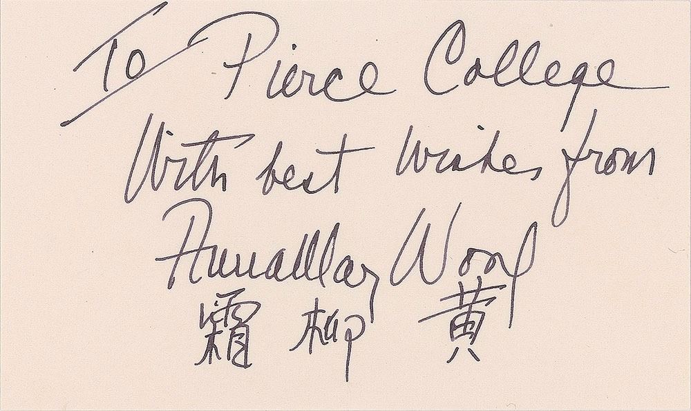 Vintage fountain pen signature, "To Pierce College, With best wishes from Anna May Wong,” on an off-white 5 x 3 card. In very fine condition.