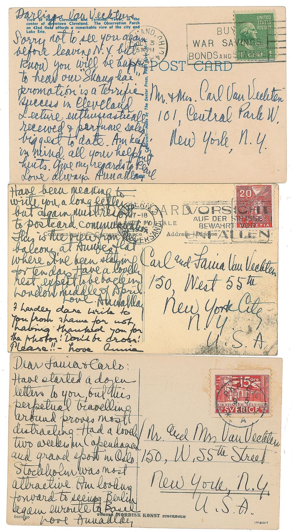 Collection of three ALSs by Anna May Wong on postcards sent to noted photographer Carl Van Vechten, all signed "Anna May," each 5.25 x 3.25, postmarked in the 1930s and 1940s. The first, in part: "This is the view from the balcony at Annie's flat where I've been staying for ten days." The second, in part: "Have started a dozen letters to you, but this perpetual travelling around proves most distracting. Had a lovely two weeks…Stockholm was most attractive." The third, in part: "Know you will be happy to hear our 'Shanghai' promotion is a terrific success in Cleveland. Lecture enthusiastically received & perfume sales biggest to date." In overall fine condition.