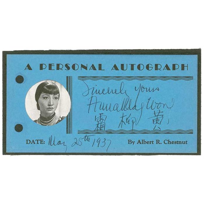 Vintage fountain pen signature, “Sincerely yours, Anna May Wong [then signing again in Chinese], May 25th, 1937,” on a 5.5 x 2.75 blue card from the Albert R. Chestnut collection. In fine condition, attached to a slightly larger black card, with a small photo attached to the left blank area. From his Pennsylvania home, Chestnut, a printer by profession, began collecting autographs in 1935. He sent these personally-printed cards to over a thousand celebrities and received favorable replies from the vast majority, finally retiring from collecting to raise his family when postage increased from 2¢ per card! Pre-certified PSA/DNA and RRAuction COA.