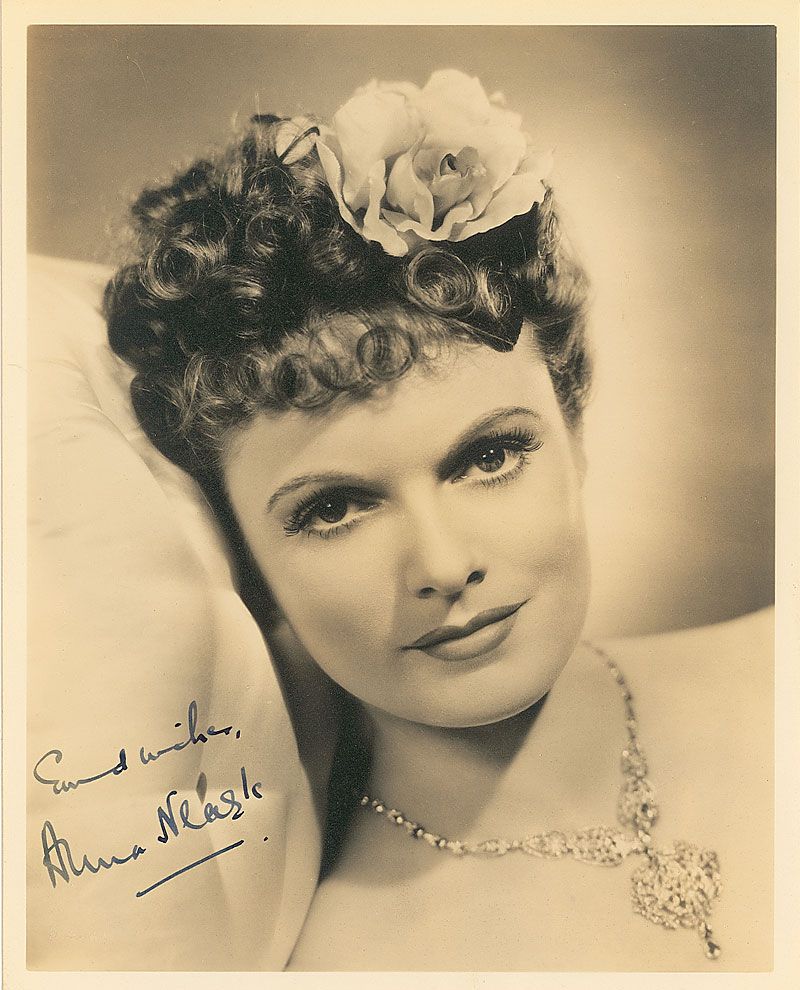 Pretty vintage matte-finish 8 x 10 head-and-shoulders photo, signed in fountain pen, “Good wishes, Anna Neagle.” In fine condition.