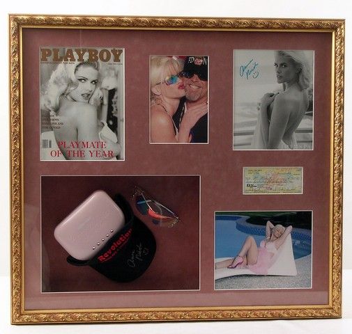 One of the most complete and beautiful museum quality displays collections of the topsy-turvy and tragic life of the stunning and controversial Anna Nicole Smith. All from the personal collection of her long time bodyguard, friend and confident, William Castleberry. They include an original cover of her June 1993 Playboy cover as "Playmate Of The Year", a rare color photo of Anna with Castleberry (wearing the supplied designer sunglasses), a personally signed black and white photo from "Trimspa", in which she was a main and popular spokesperson, a cancelled rent check signed by Anna, in her real named "Vickie Lynn Smith", a unique poolside lingerie color photo, and a shadowbox display with a pair of her personal faux-diamond designer sunglasses, along with her much worn Revolution Eyewear embroidered visor, which she has personally signed, and her pink and faux-jeweled "Bling Bling Lunettes" double custom eye case and purse. This massive display is double matted, and backed in special textured pink. It is a massive 32"x28").