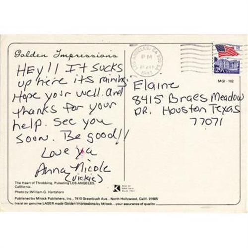 <B>Anna Nicole Smith Handwritten and Signed Postcard.</B></I> A postcard from Los Angeles, postmarked January 20, 1993, and addressed to "Elaine" with a message handwritten by Smith in black ink. It reads: "Hey!! It sucks up here its sic raining. Hope your sic well. And thanks for your help. Be good!! Love ya, Anna Nicole (Vickie)." In Excellent condition with minimal wear. <I>Accompanied by LOA from PSA/DNA.</B></I><BR><BR><b>Shipping:</b> Flat Material, Small (<a target="_blank" href="http://www.heritageauctions.com/common/shipping.php">view shipping information</a>)