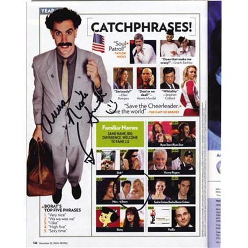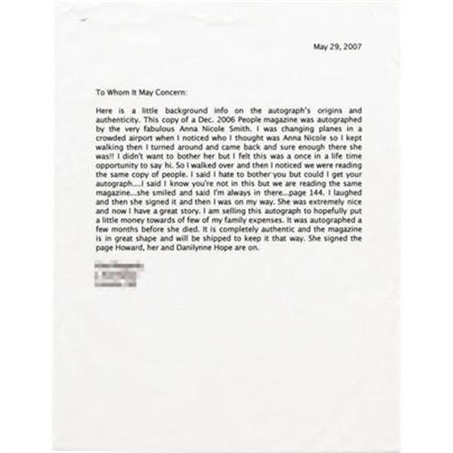 <B>Anna Nicole Smith Signed People Magazine.</B></I> A"Best of 2006" issue of <I>People</B></I> magazine, signed by Smith in black ink on page 144. Accompanied by an interesting letter of provenance, in which Smith was quoted as saying of her coverage in <I>People</B></I>: "I'm always in there... page 144." Anna Nicole's signature is near her image on that page, with her trademark smily face and a directional arrow pointing to the small photo of Anna with her newborn daughter. In Excellent condition. <I>Accompanied by LOA from PSA/DNA.</B></I><BR><BR><b>Shipping:</b> Flat Material, Small (<a target="_blank" href="http://www.heritageauctions.com/common/shipping.php">view shipping information</a>)