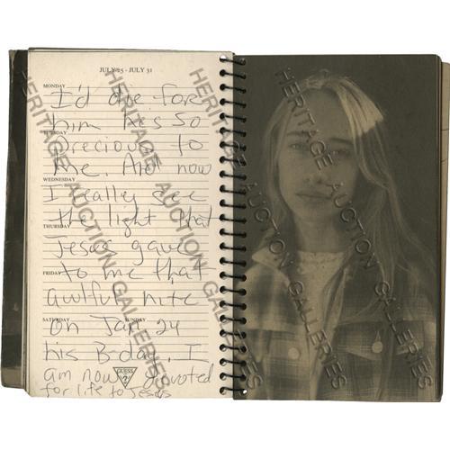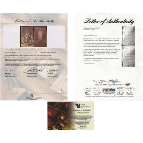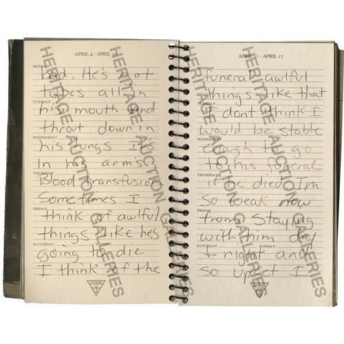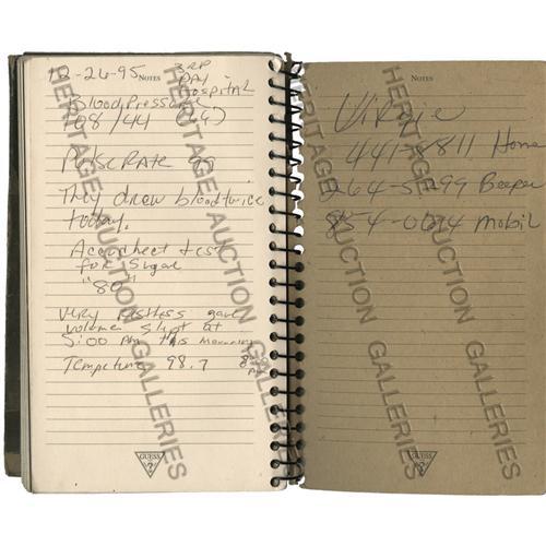 <B>Anna Nicole Smith's Personal Journal From 1994.</B></I> Absolutely fascinating diary handwritten by Smith during 1994 showing a side of her personality that has certainly not heretofore been publicly seen or examined. The book is a "Guess Kids 1994" paperback ring bound diary, 3.75" x 6" in size, with one page printed for each week. Smith has written this one entirely in black ink on various pages ranging from January 3 to December 26. There are approximately 30 pages in her writing.<BR><BR>Just exactly who was Anna Nicole Smith? Let's look at her brief autobiography as it appears on her website: "If you don't know who I am by now... Let's see, I was born near Houston, Texas. I'm an international model and have been on numerous magazine covers worldwide. I was crowned Playboy Playmate of the Year. I was also the Guess Jeans Model. I'm also an Actress. I had my own show on E!. Now I have a new movie coming out that I'm starring in (and helped produce) called 'Illegal Aliens,' but we might have to change the name for obvious reasons. Is it just me or does controversy seem to follow me around? And, of course, I am TRIMSPA's most famous customer. There's so much more, but bios are boring and I don't feel like writing any more. What else do you need to know?" Based on the amount of public curiosity her life (and death) generated, there are apparently a lot of people who need to know more. Let's let Anna Nicole reveal to us just a bit more about her life and thoughts through some brief excerpts from her journals (as written, spelling not corrected): <BR><BR>"<I>Jesus loves you yes he does Jesus love me to. He looks from up above at me and you... My husbands J. Howard Marshall very sick and weak, Theres nothing I can do I want each hour to comfort him with medicines and prayers... When you touch him Im afraid he might break... Sometimes he tries to smile and give me such hope, he a fighter and I believe he can make it...If Jesus desides to take him I dont no what I'll do. I love him so much... I wish Pierce Marshall's son would stay out of our lives and let us be...He took all the money away from me would not pay my bills... they should have never let him out of the hospital with namonia...God I just love him so... Sometimes I think of awlful things like hes going to die...I dont think I would be stable enough to go to his funeral if he died... I need some support and I have none. But I do have Jesus and my Director is comming down to support me. He's the one who brought me back to Jesus... I can't dare sleep cause he will pull out that breathing tube. No one else stays here but a few minutes. But im his wife and I want to be here... Ive cried so much I dont have any tears... My husbands much better...I believe hill live to a hundred and 10 and still keep fighting untill the End... My husband has had a miracle. Jesus let him stay he new he shouldnt take him away... I'd die for him hes so precious to me... I am now devoted for life to Jesus...</B></I>"<BR><BR>There are many incredibly revealing, humorous, and touching words penned in this diary. When, early in her career, Anna Nicole announced that she planned to become "the next Marilyn Monroe," one has to wonder if she knew that her life would end so similarly to the voluptuous blonde bombshell of a previous generation. There are certainly parallels to be drawn. <I>PSA/DNA as well as GAI certification is included.</B></I><BR><BR><b>Shipping:</b> Flat Material, Small (<a target="_blank" href="http://www.heritageauctions.com/common/shipping.php">view shipping information</a>)