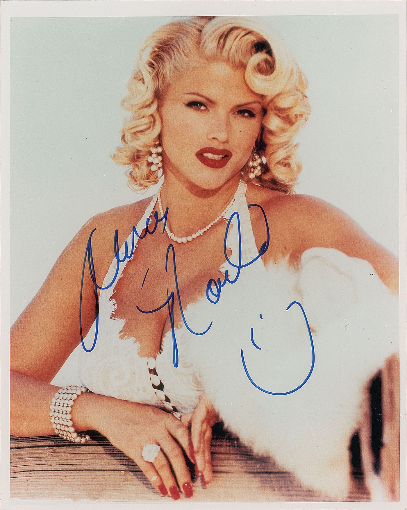 Color glossy 8 x 10 photo of the stunning Playboy model, signed in blue felt tip by Smith, who adds a smiley face. In fine condition. Originally obtained by in-person specialist Mike Wehrmann.