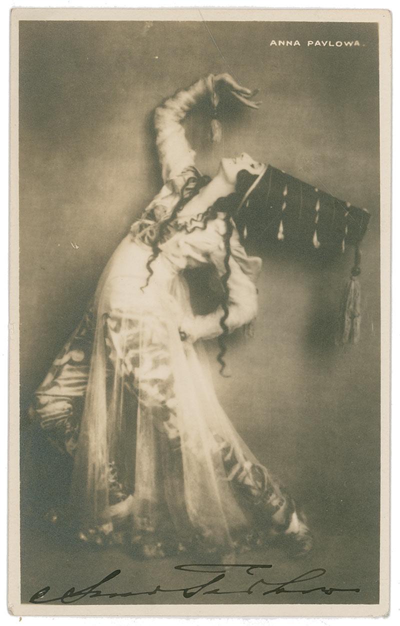 Russian-born prima ballerina (1881–1931) who won international fame for her exquisite interpretations of classical roles. Vintage 3.25 x 5.25 postcard photo of Pavlova in an ornate costume, signed in fountain pen. In fine condition, with a few scattered areas of light silvering.