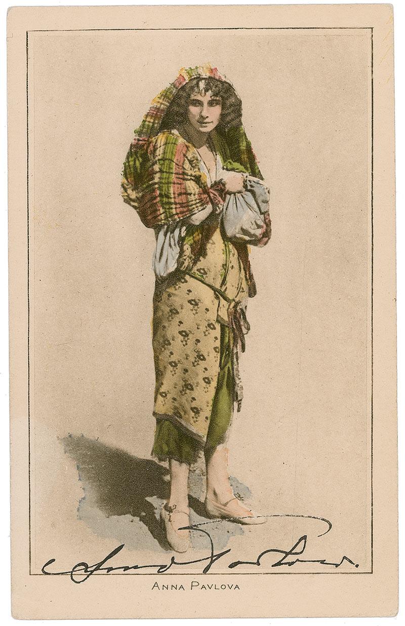 Russian-born prima ballerina (1881–1931) who won international fame for her exquisite interpretations of classical roles. Fantastic vintage 3.5 x 5.5 postcard photo of Pavlova in an ornate costume, neatly signed in fountain pen. In fine condition, with a few scattered areas of light soiling.