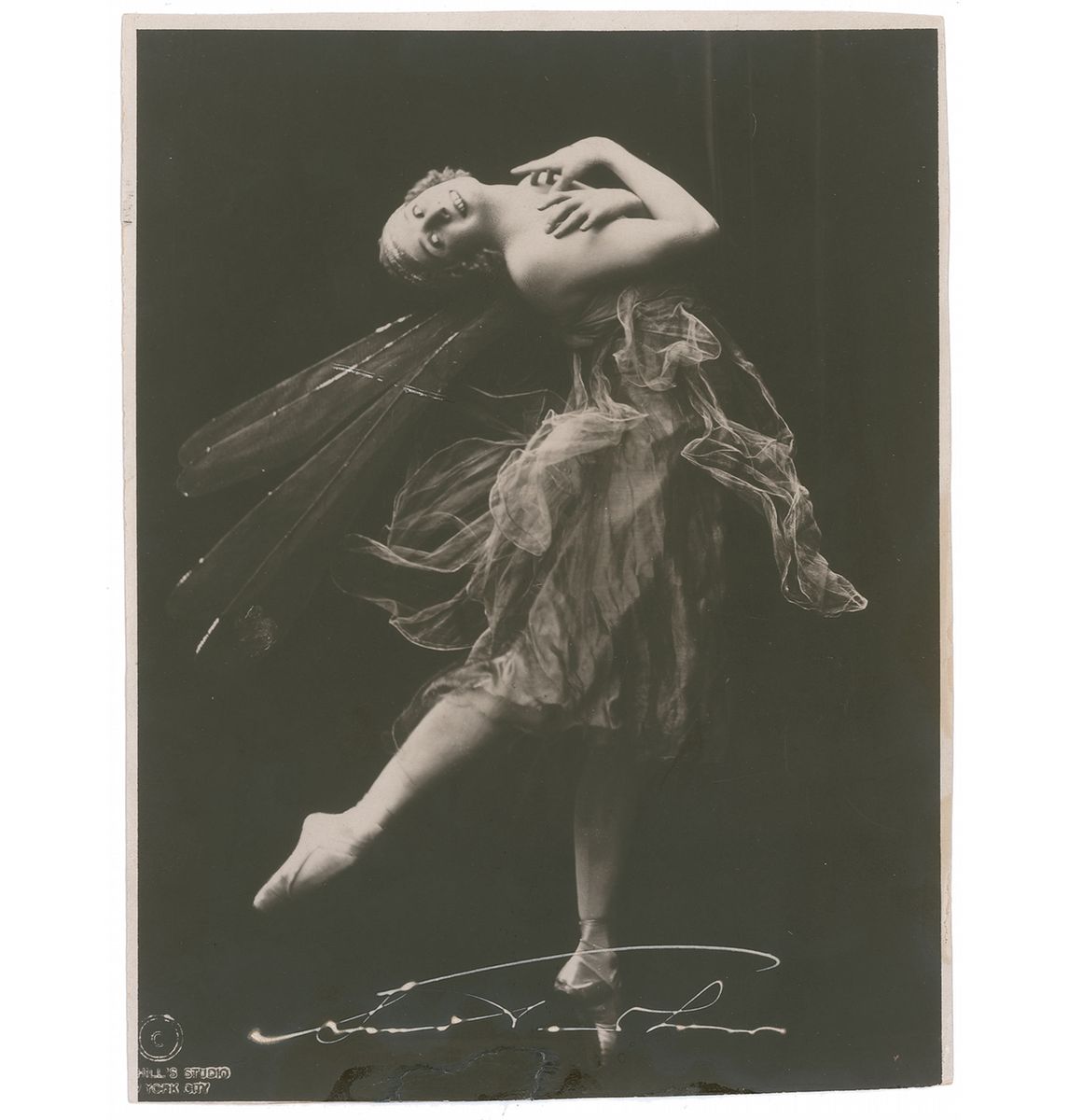 Russian-born prima ballerina (1881–1931) who won international fame for her exquisite interpretations of classical roles. Vintage matte-finish 6.5 x 9 photo of Pavlova from The Dragonfly, signed in white ink. In very good condition, with trimmed bottom edge, repaired tear and adhesive remnants to bottom edge, and some light pooling to signature.
