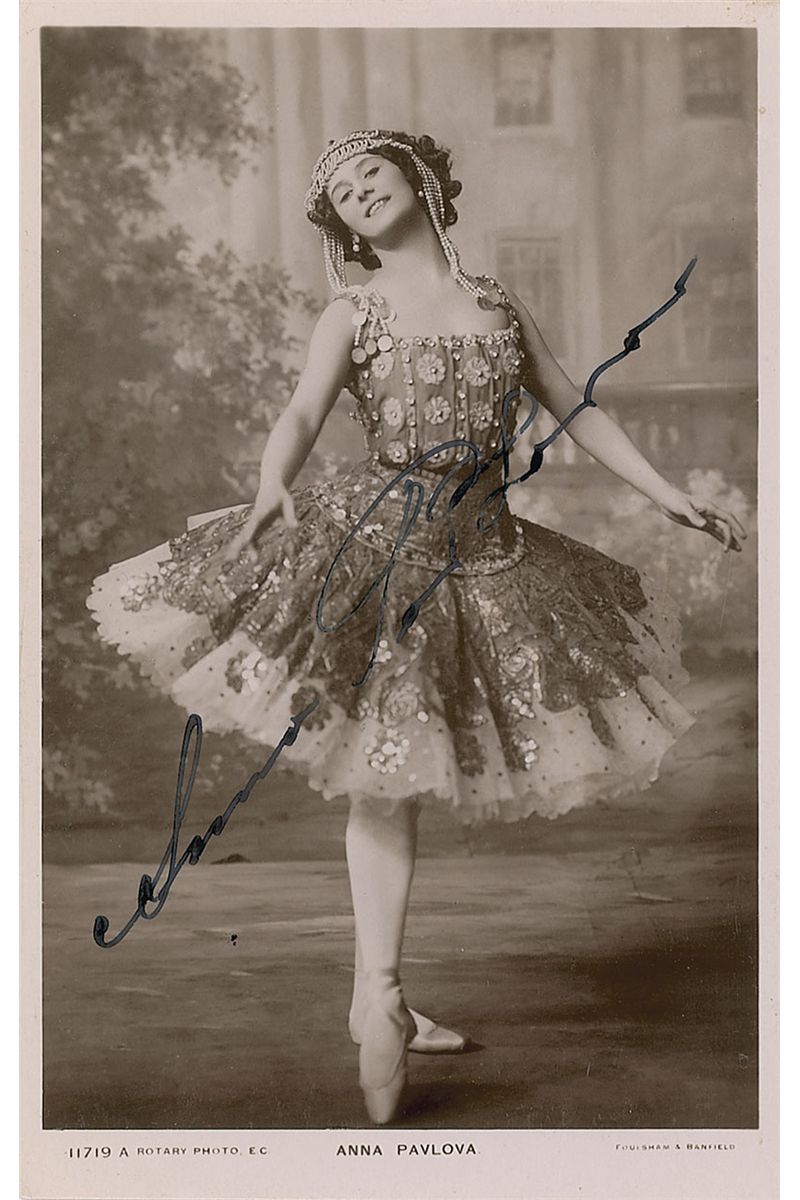 Russian-born prima ballerina (1881–1931) who won international fame for her exquisite interpretations of classical roles. Vintage glossy 3.25 x 5.25 postcard photo of Pavlova posing in costume, signed in fountain pen. In fine condition, with a few scattered light surface marks.