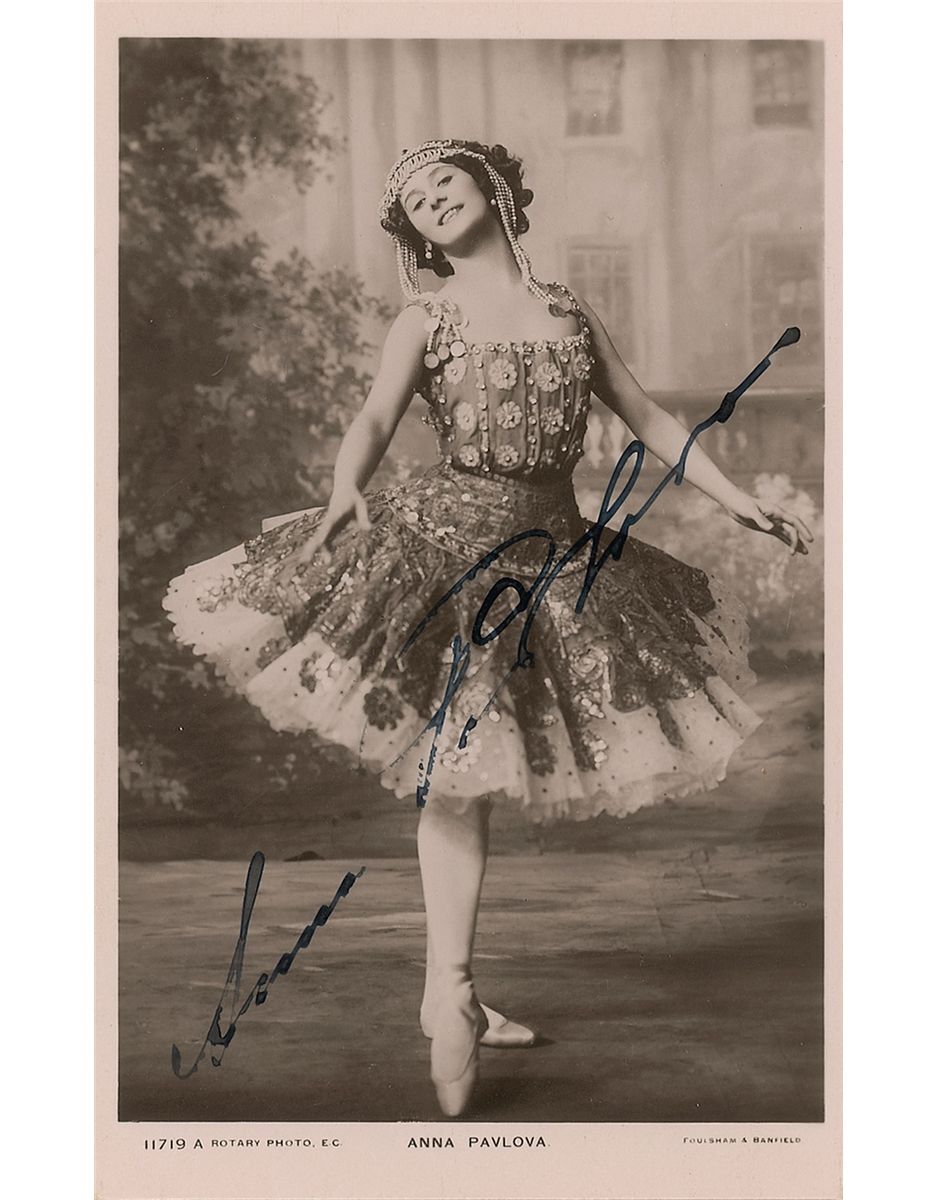 Russian-born prima ballerina (1881–1931) who won international fame for her exquisite interpretations of classical roles. Choice glossy 3.5 x 5.5 real photo postcard of Pavlova in costume, nicely signed in fountain pen. In fine condition.