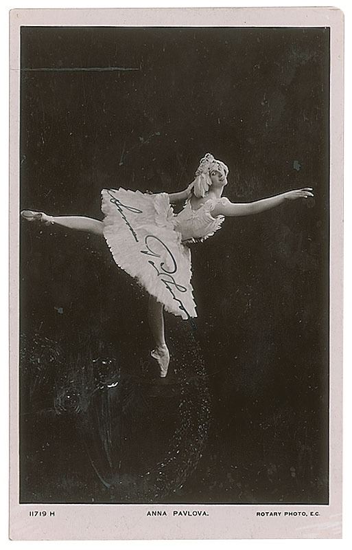 Vintage glossy 3.5 x 5.5 Rotary Series postcard photo of Anna Pavlova gracefully displaying her pointe technique, signed in fountain pen. In very good to fine condition, with light scuffing, and a horizontal surface slice to the upper left background.