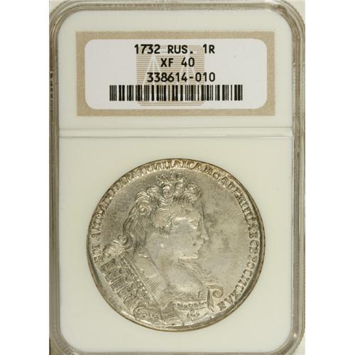 <B>Anna. Rouble 1732, Moscow</B></I> Bit-53 var., XF40 NGC. Nicely struck, but appears to have been cleaned in the past leaving a lustrous appearance.<BR><BR><b>Shipping:</b> Coin/Currency (<a target="_blank" href="http://www.heritageauctions.com/common/shipping.php">view shipping information</a>)