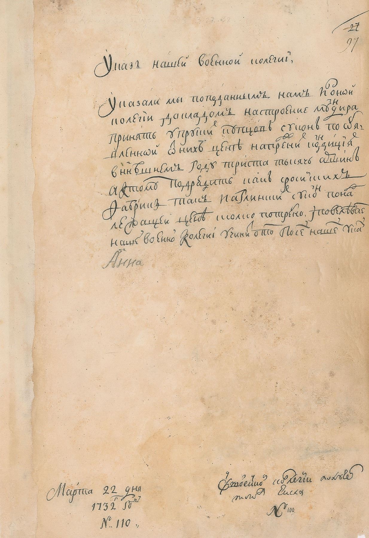 Duchy of Courland (1693–1740) who later ruled as Empress of Russia from 1730 to 1740. Manuscript DS in Russian, signed “Anna,” one page, 8.25 x 12, March 27, 1732. Document directed to the military college, in full (translated): "On the basis of the report submitted to us by the College we have ordered that the cloth for making uniforms in the amount of three hundred thousand arshins be received from the Prussian merchants this year at the price they had announced under the former conditions, and, in addition, to contract for as much cloth as is necessary from the Russian and English factories at the appropriate price. And we order our MIlitary College that this be done according to this our decree." Signed at the conclusion by Anna. In very good condition, with light mottled staining, a tear to the top edge, and a strip of old mounting remnant along the left side.