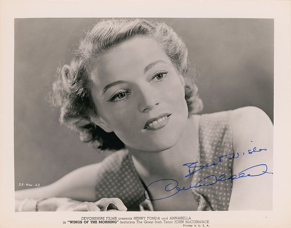 Glossy 10 x 8 Devonshire Films publicity photo for Wings of the Morning, signed in blue felt tip, “Best wishes, Annabella.” In fine condition, with a few light surface impressions.