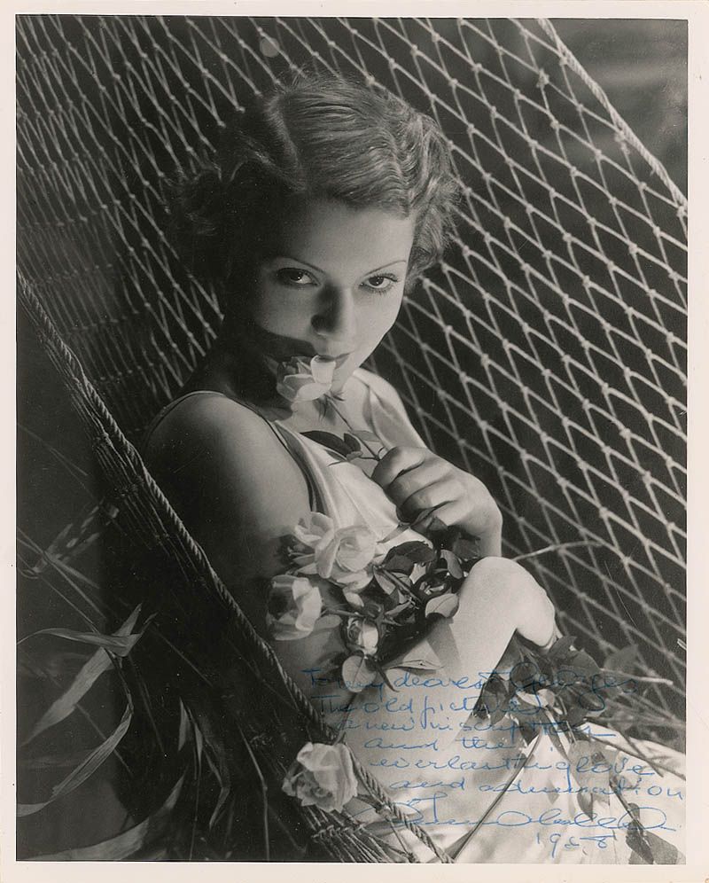 Attractive matte-finish 8 x 10 photo of Annabella with a bundle of roses, signed and inscribed in blue ballpoint “To my dearest Georges, The old picture, a new inscription, and the everlasting love and admiration of Annabella, 1968.” In fine condition, with a couple light surface impressions.
