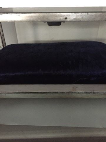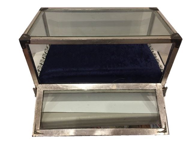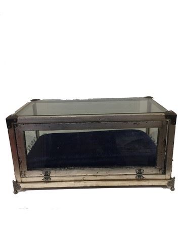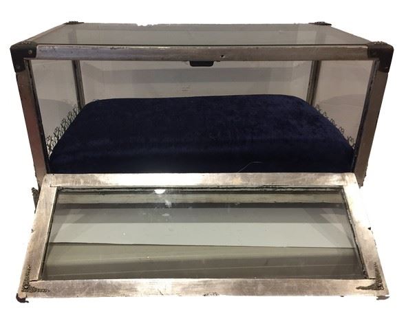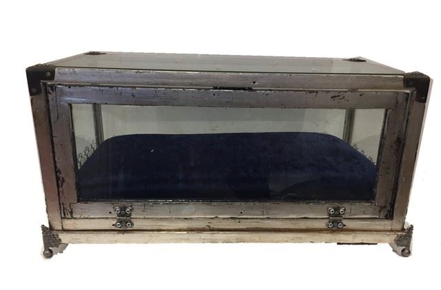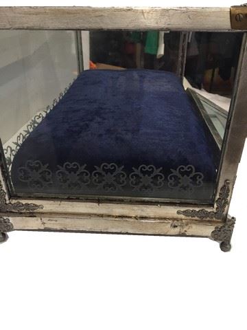 Large glass and metal display box used to store a doll. Case is made of metal and glass with a velvet blue cushion for the doll to lay on. Metal intricate design all around the box, the front of the box opens towards you and the doll can be removed with ease. The case is very heavy. The case also has a four leg design to help elevate off of the surface. (21"x12"x10")