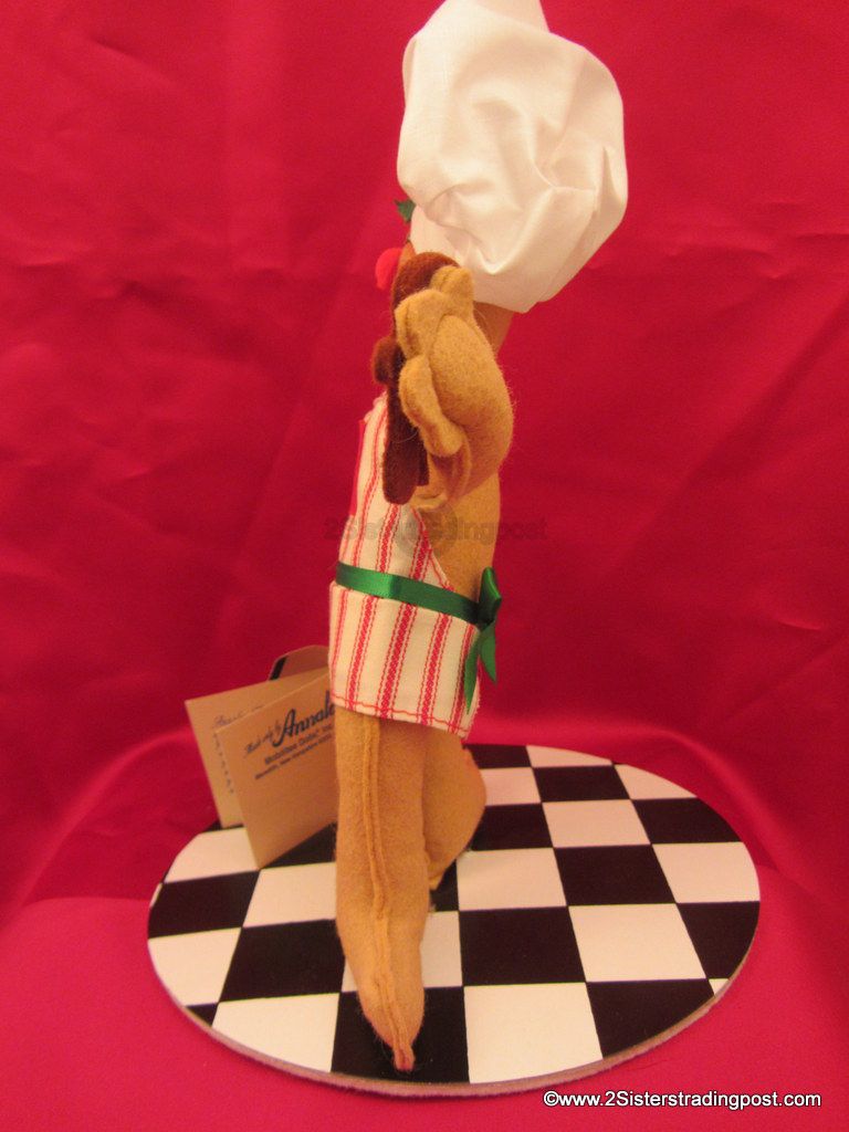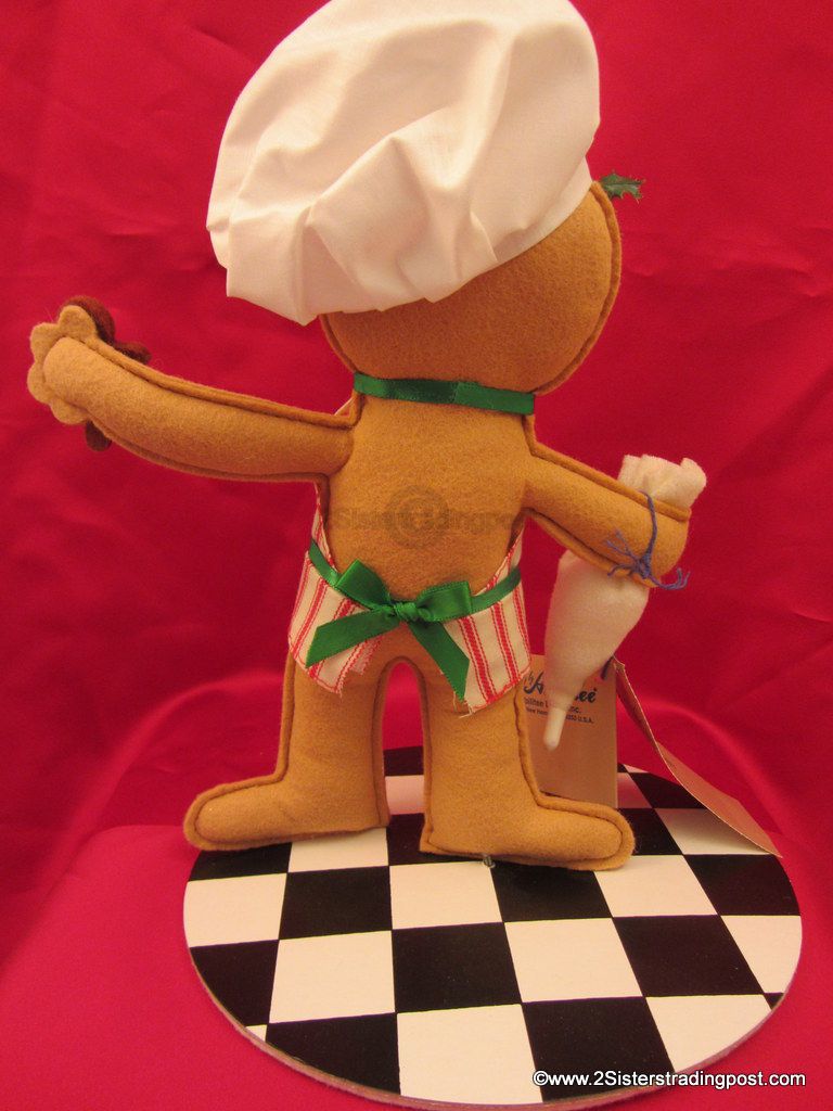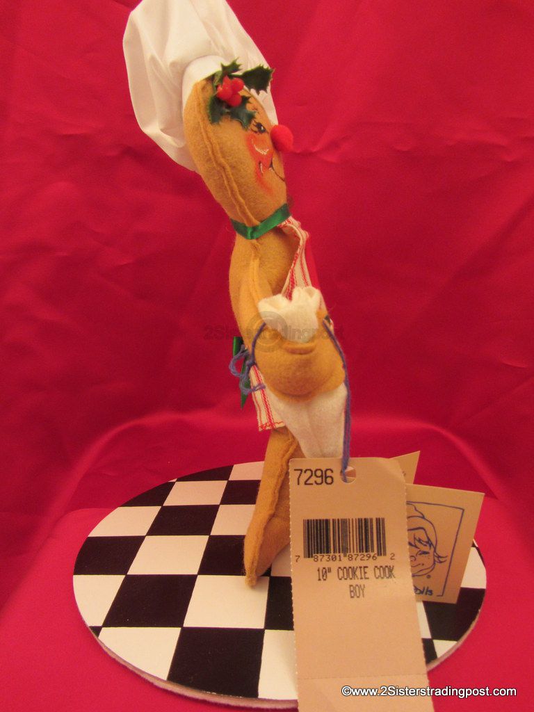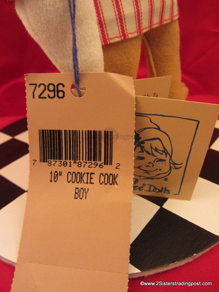 RETIRED 1998 Annalee Christmas Doll 10" Cookie Cook Boy has open eyes and big grin. He is dressed in a chefs hat and striped apron. Cook Boy holds a pastry decorating tube in one hand and a gingerbread man cookie in the other. He stands on a black and white checkered hard board circle. Comes new with original tags. NOTE: is not in original packaging