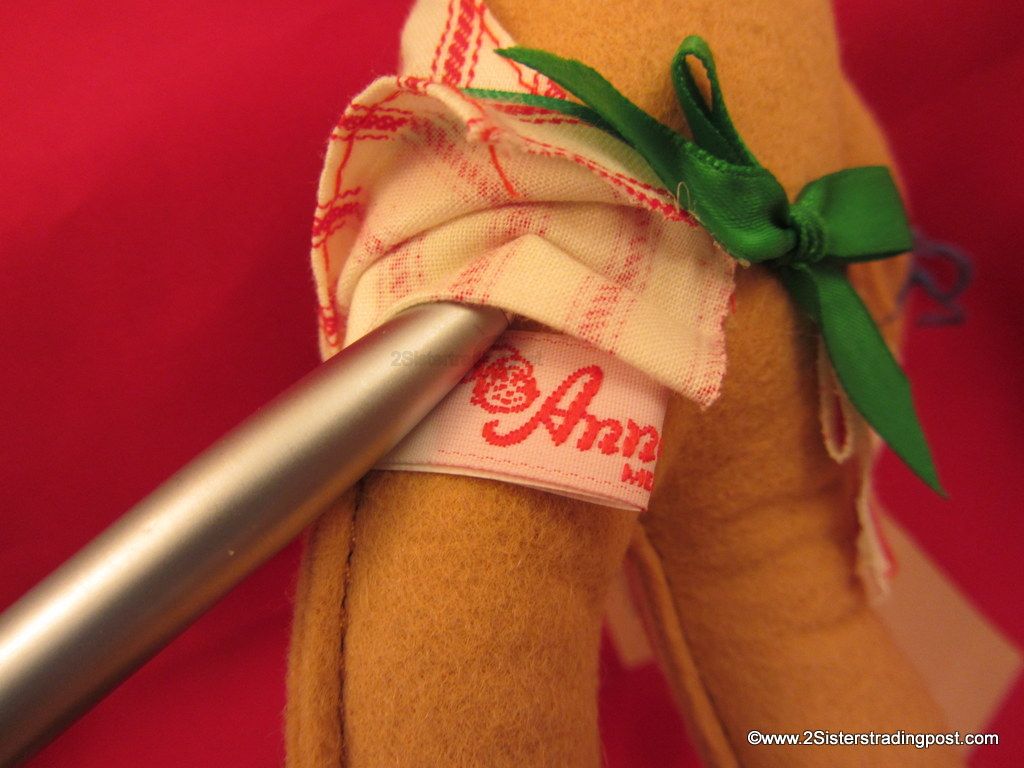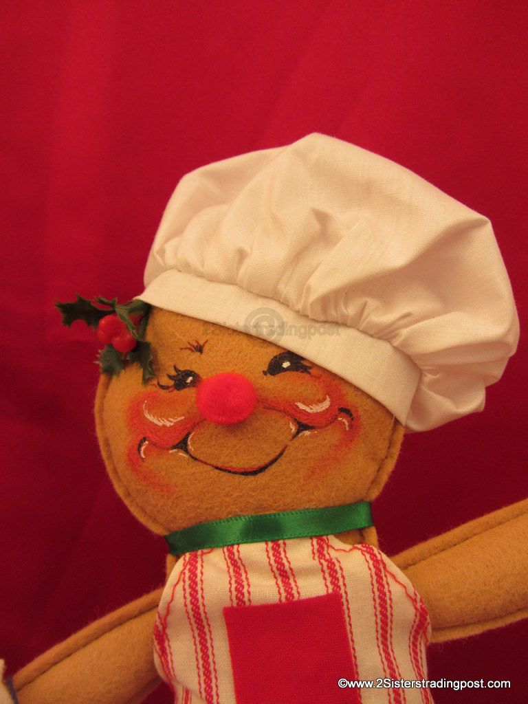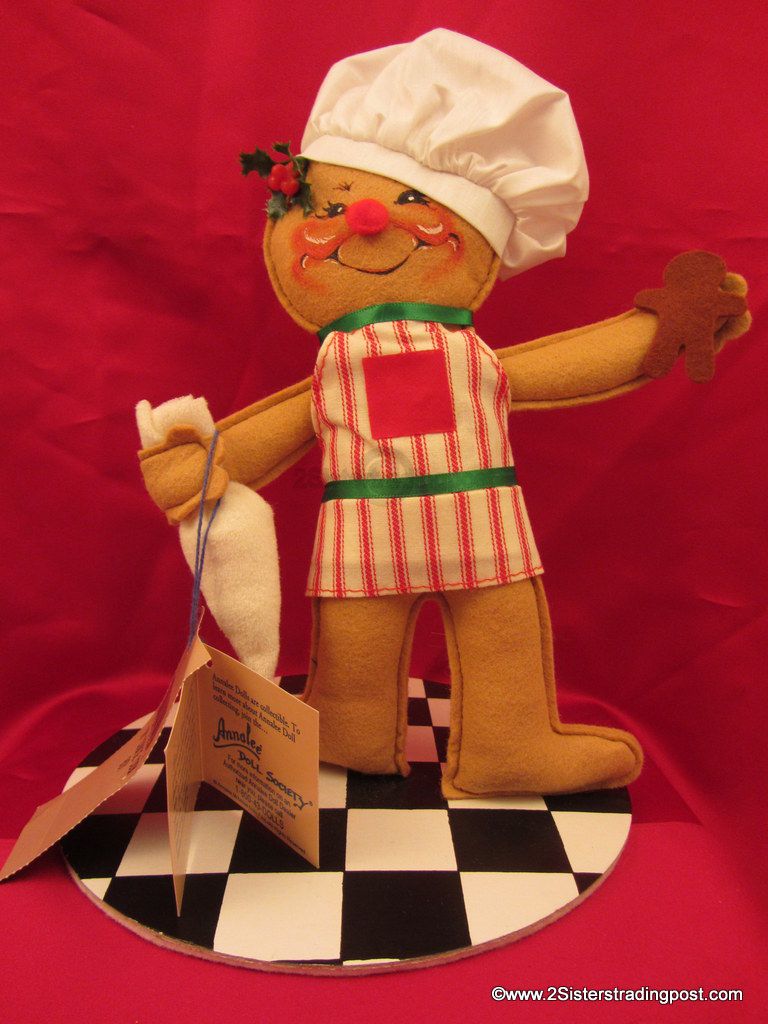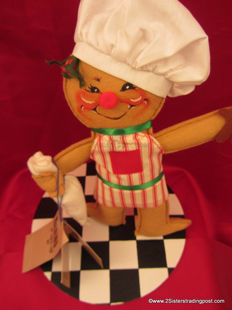 RETIRED 1998 Annalee Christmas Doll 10" Cookie Cook Boy has open eyes and big grin. He is dressed in a chefs hat and striped apron. Cook Boy holds a pastry decorating tube in one hand and a gingerbread man cookie in the other. He stands on a black and white checkered hard board circle. Comes new with original tags. NOTE: is not in original packaging
