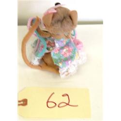 This whimsicle Annalee Doll was made in 1965. She is approximately 6 inches. She is dressed in a blue floral dress and is carrying a knitting basket and yarn with knitting needles in her hands. She is in her original case and is in excellent condition.