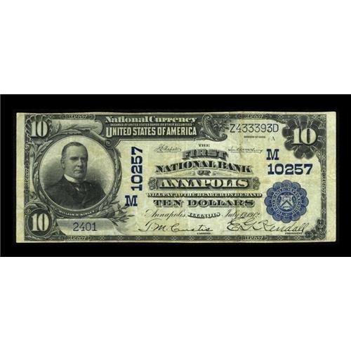 <B>Annapolis, IL</B></I> - $10 1902 Plain Back Fr. 628 <B>The First NB</B></I> Ch. # (M)10257<BR>Six large notes are known on this Crawford County institution. This <B>Fine-Very Fine</B></I> example hails from a CAA sale in September 2000.<BR><I>From The Lincoln Collection</B></I><BR><BR><b>Shipping:</b> Coins & Currency (<a target="_blank" href="http://www.heritageauctions.com/common/shipping.php">view shipping information</a>)