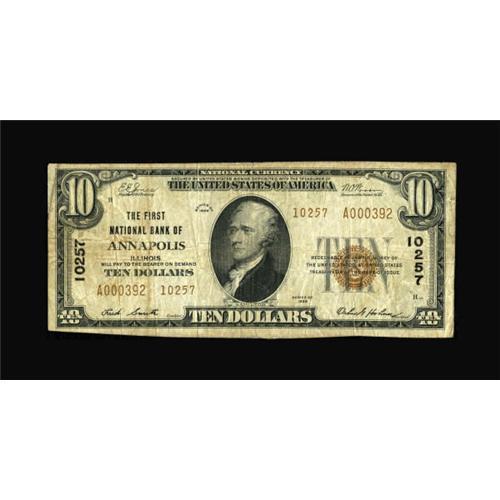 <B>Annapolis, IL</B></I> - $10 1929 Ty. 2 <B>The First NB</B></I> Ch. # 10257<BR> This is the first Type 2 $10 reported for the bank. <B>Very Fine.</B></I><BR><BR><b>Shipping:</b> Coins & Currency (<a target="_blank" href="http://www.heritageauctions.com/common/shipping.php">view shipping information</a>)