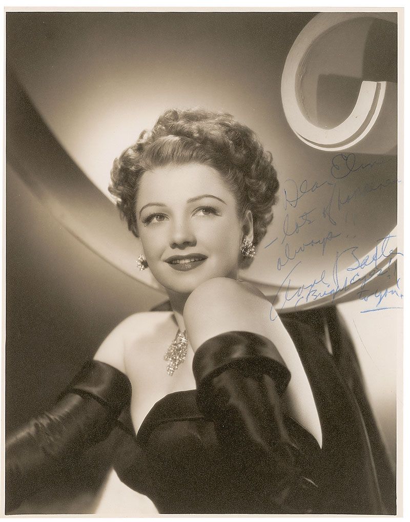 Vintage 7.5 x 9.5 photo of Baxter in a dazzling outfit, signed and inscribed in blue ink, “Dear Elmer—lots of happiness always!! Anne Baxter (Bright Eyes to you!).” In fine condition, with slightly trimmed edges and slight brushing to inscription.