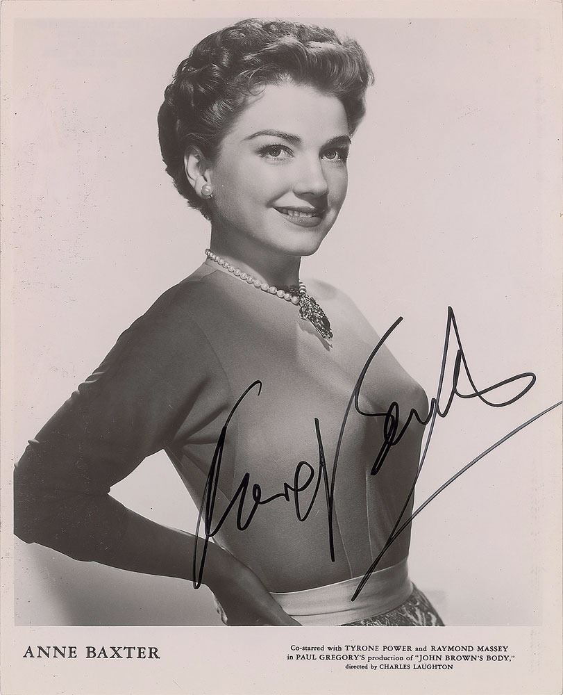 Two glossy 8 x 10 publicity photos of Baxter, both signed in black felt tip; one showing the actress in a full-length seated pose, and another of Baxter in a half-length pose with her hands on her waist. In overall fine condition, with scattered light creasing. From the Harvey and Rhoda Kuflik Collection.