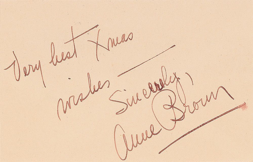 Soprano (1912–2009) who created the role of Bess in the original production of George Gershwin's opera Porgy and Bess in 1935. Christmas card measuring 4.25 x 2.75 closed, featuring a color image of a snowy farm house on the front, signed inside, “Very best Xmas wishes—Sincerely, Anne Brown.” In fine condition, with a bit of light mirroring of ink to inside of front cover.
