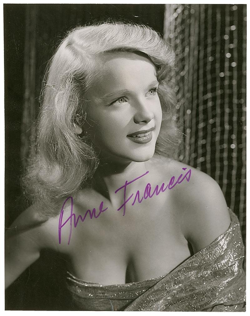 Vintage glossy 6.75 x 8.5 photo of the smiling starlet in a low-cut dress, signed in purple felt tip “Anne Francis.” Date-stamped October 14, 1950, on the reverse. In very good condition, with scattered creasing, surface impressions, light crazing, some of which touch her likeness and signature, and trimmed edges.