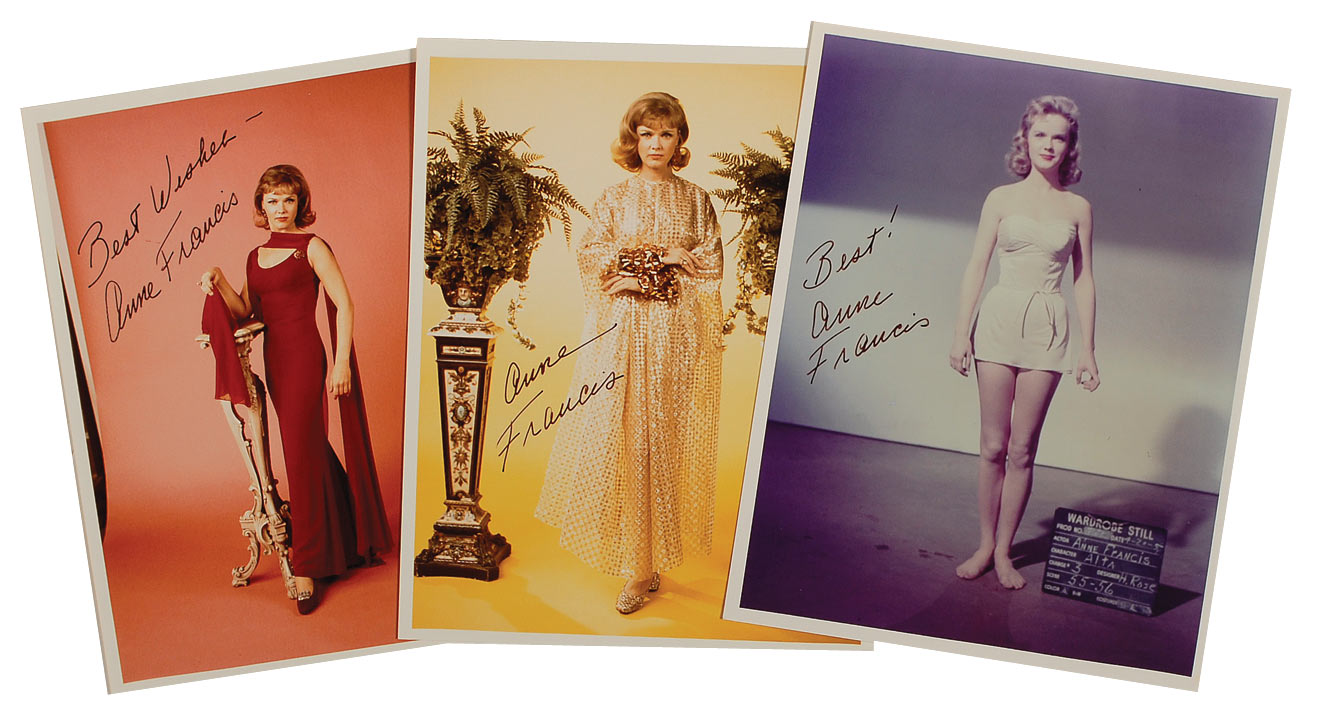 Three color glossy 8 x 10 full-length photos of Francis, each signed in black felt tip, adding a brief sentiment to two of the photos. In fine condition.