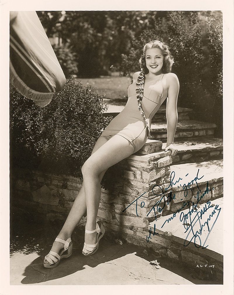 Actress (1918—2003) known as the first ‘Scream Queen’ for her horror films and was one of the most popular of all WWII pinup girls. Cardstock 8 x 10 photo of Gwynne lounging in a one-piece bathing suit, signed and inscribed in black felt tip “To John—To the ‘good old movies!’ Good luck, Anne Gwynne.” In fine condition, with a couple light surface dings and trivial creases to top left corner tip.