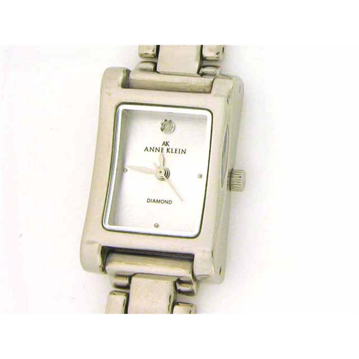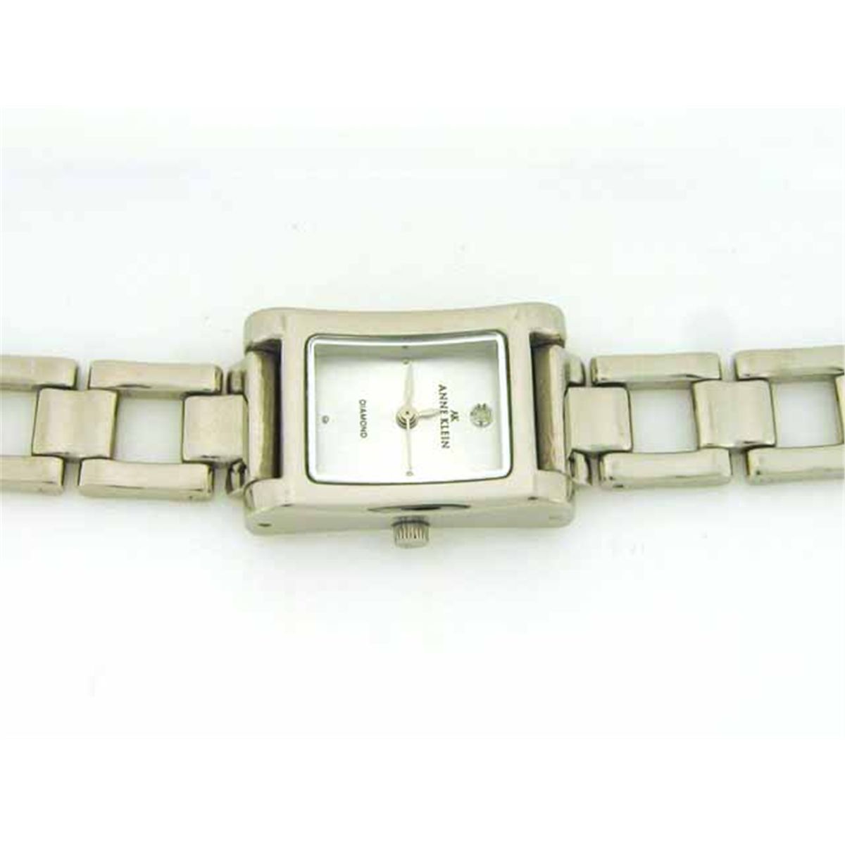 This is an Anne Klein Concave Shape Case Watch 10/3761 with the following features: Casual watch, Japanese quartz movement, silver-tone sword hands and sweep seconds, Genuine diamond hour marker at twelve o'clock, silver-tone dot hour markers at three, six and nine o'clock, White dial, silver-tone metal open-square-link bracelet with jewelry-clasp, Curved polished silver-tone metal rectangular case, Textured silver-tone metal crown, Stainless steel caseback, and watch length is 7-1/4 inches long with the 1/2 inch extra link.