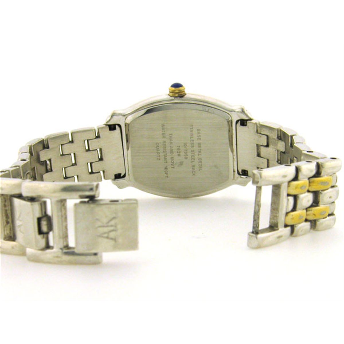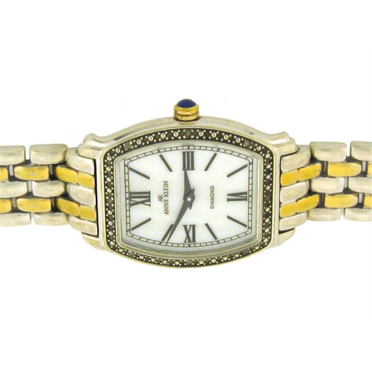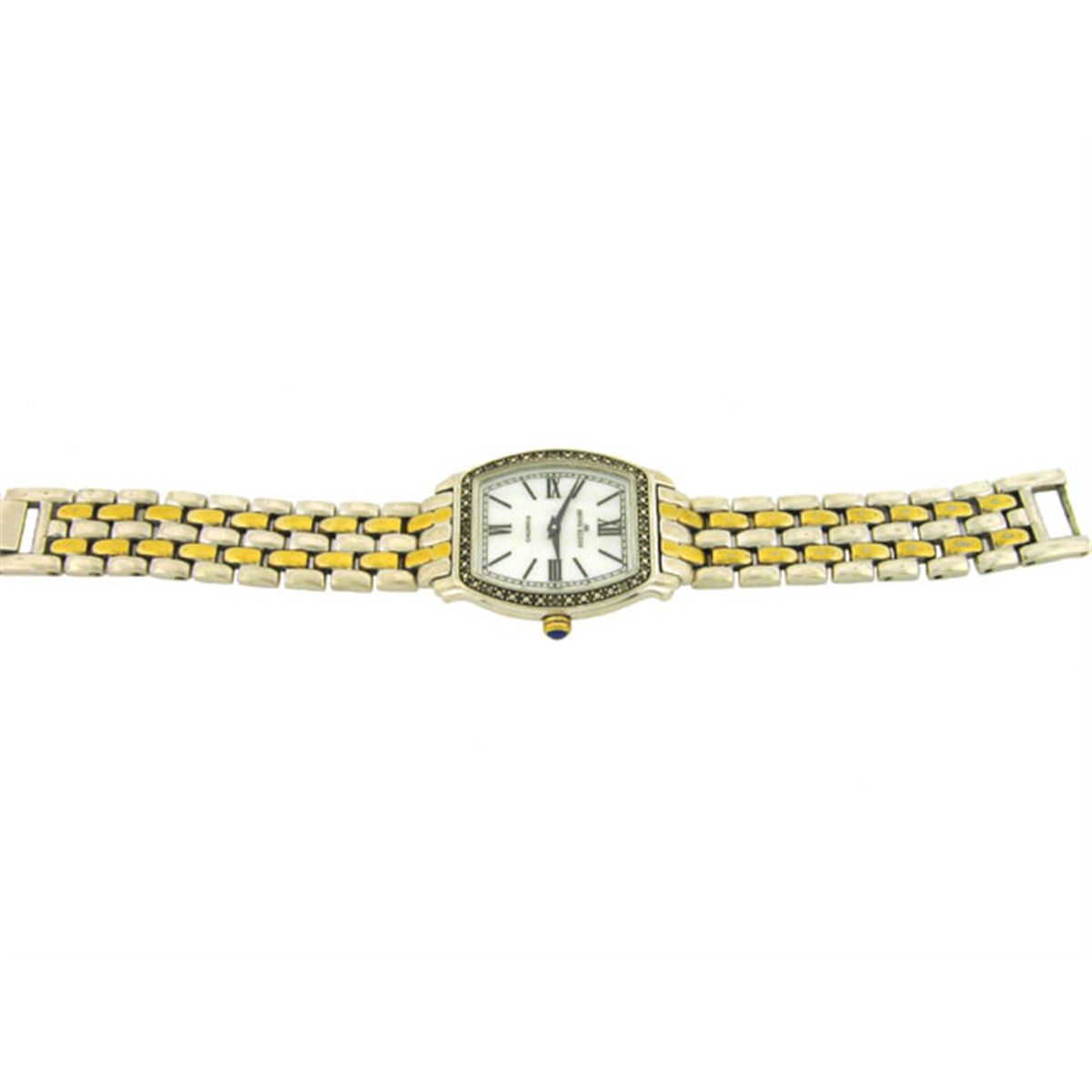 Silver and Goldtone Diamond bezeled bracelet; Mineral crystal; Black Roman numeral and rectangular bar hour markers on a Mother-of-pearl face; Bezel measures 30mm by 25mm with a 22mm by 18mm crystal; Bracelet meaures 13 mm in width and will accomodate a 6 1/2'' circumference wrist; Quartz movement; and Case Thickness: 6 millimeters