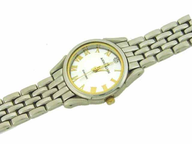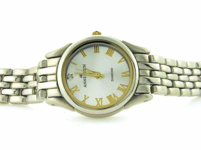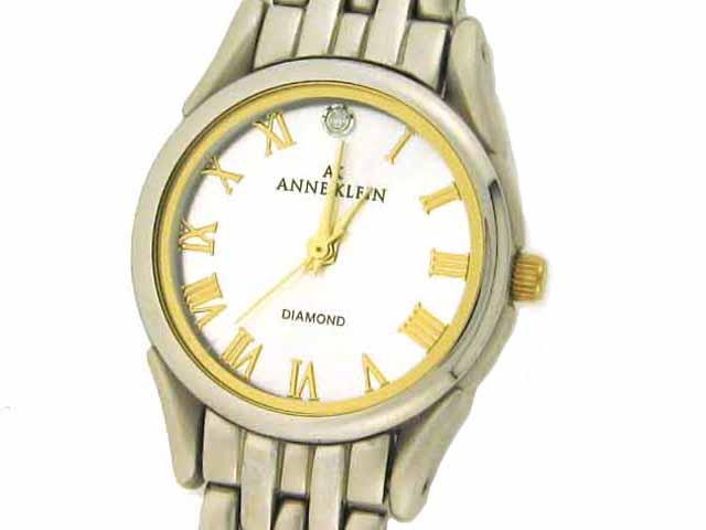 Anne Klein Two Tone Round Watch 10-4639TTDI with the following features: Japanese quartz movement, Diamond hour marker at twelve o'clock, - gold-tone Roman numerals, silver dial, silver-tone metal bracelet with jewelry-clasp, silver tone metal bezel,