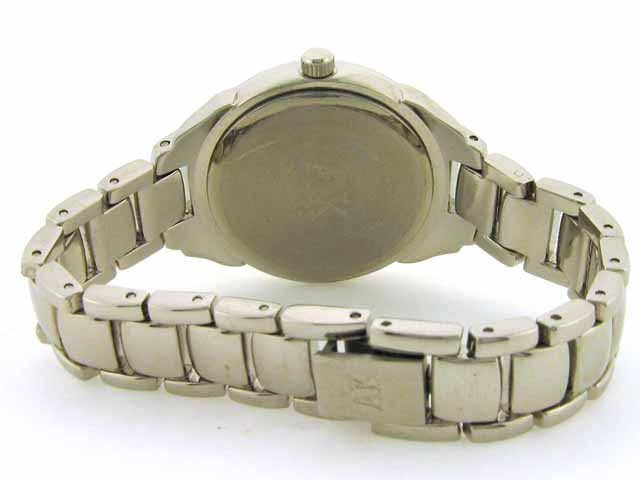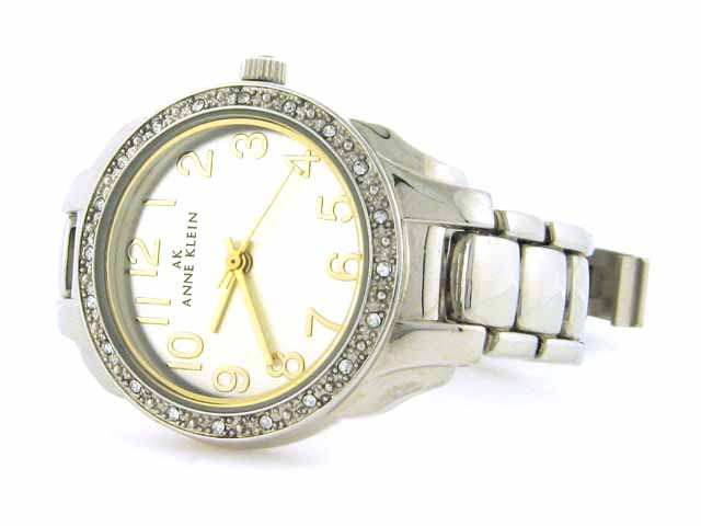Anne Klein Two Tone with Crystals Watch 10-8867 with the following features: Casual watch, Japanese quartz movement, gold-tone hands and seconds, gold-tone Arabic numbers, silver dial, silver-tone metal bracelet with jewelry-clasp, silver-tone metal bezel with crystals, silver-tone metal round case, gold-tone metal crown, Stainless steel caseback, 29.5mm Case Diameter, 7mm Case Thickness, and watch length is 6-1/4 inches long.